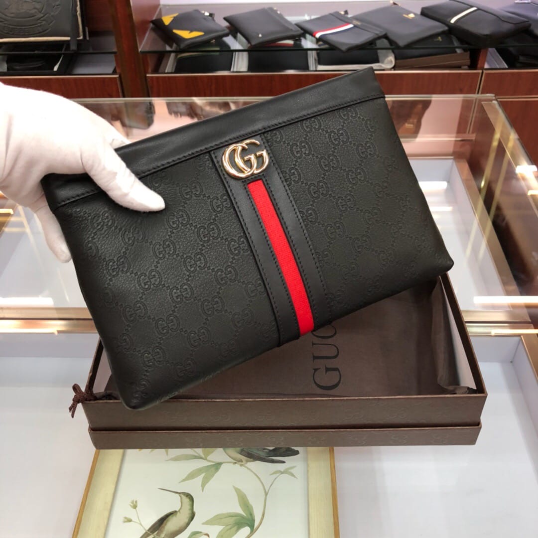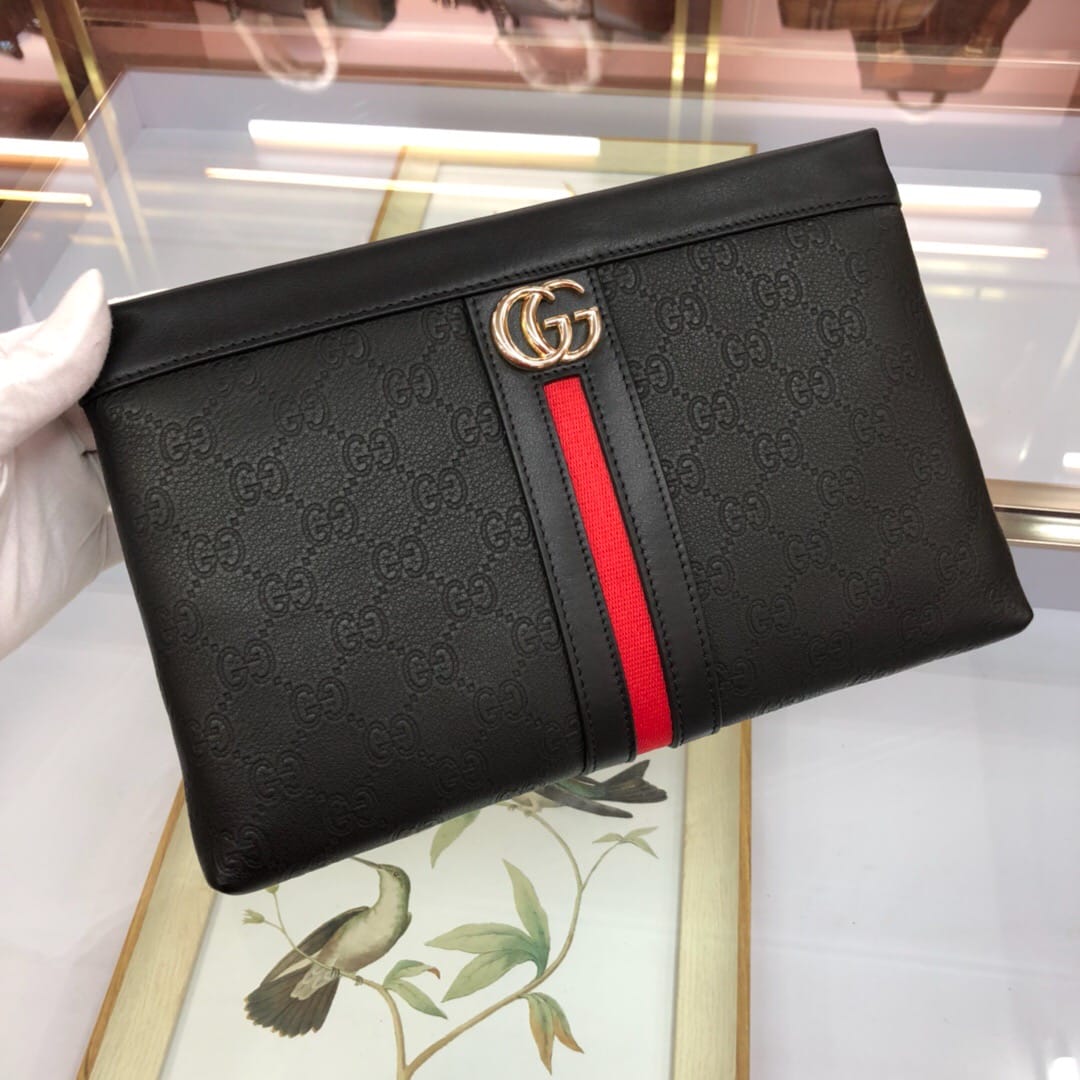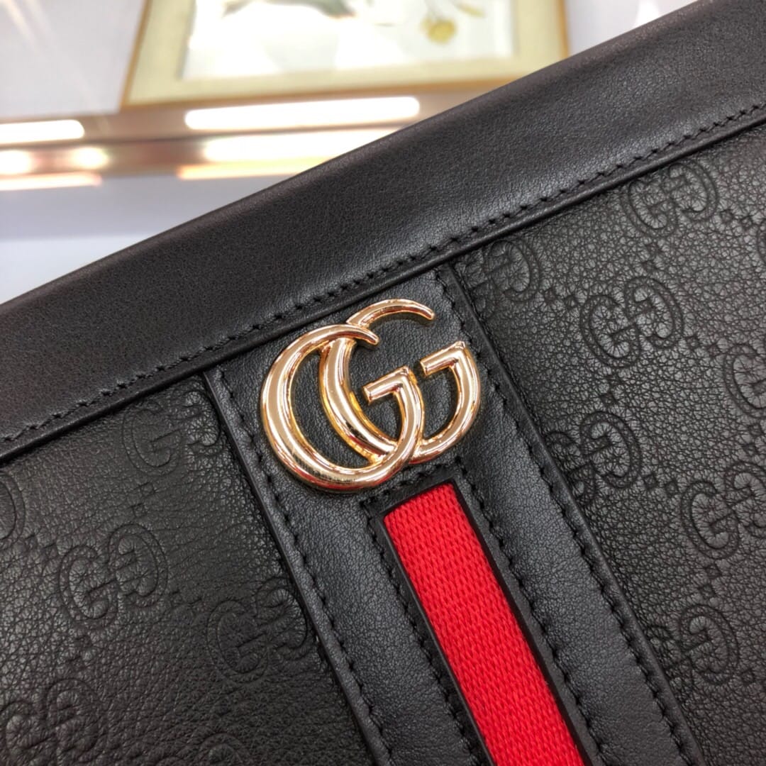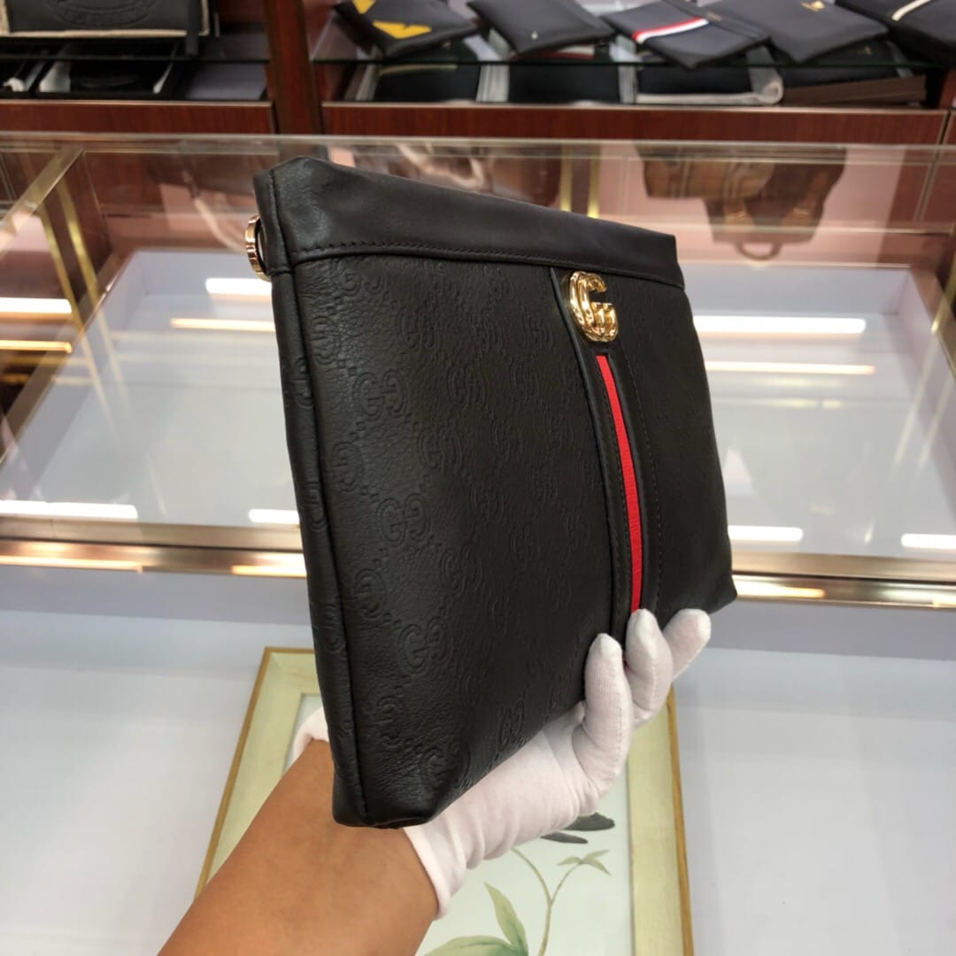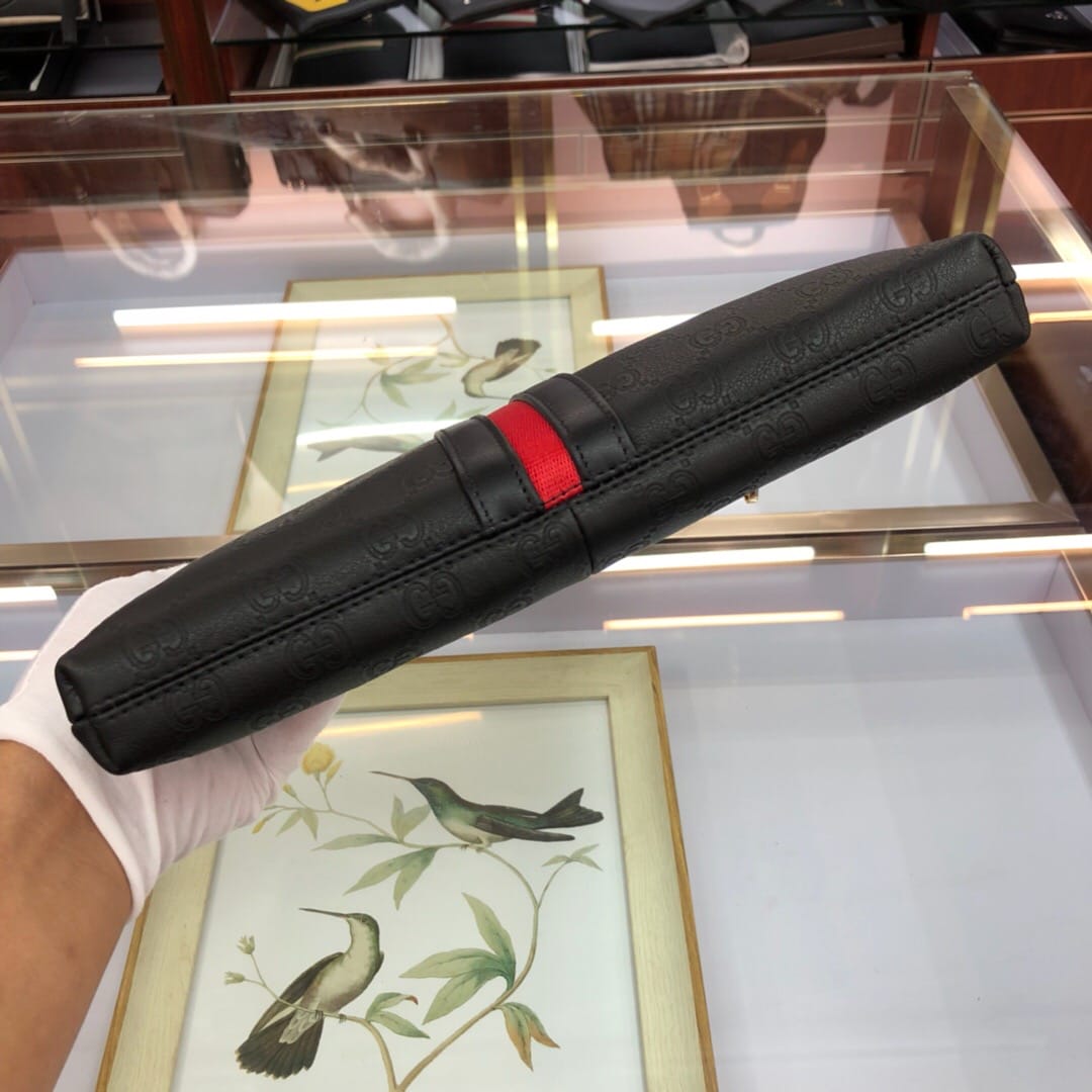 原单网266手拿包GG图案花牛皮配有可拆卸肩手包,使用Gucci Signafure高级人造帆布制作,黑色和灰色组合,除了GG图案外,还在中间位置加入一条红色织带,这是Gucci经典热压皮革的新版本,结构更具延展性,(意大利创作)尺寸:28*1*18cm