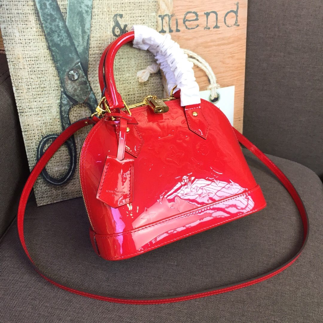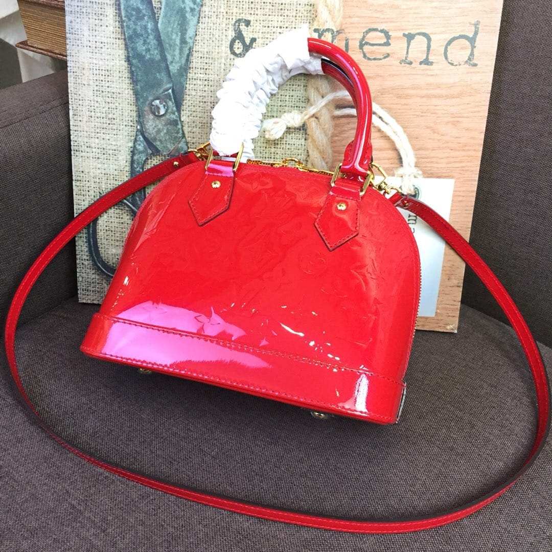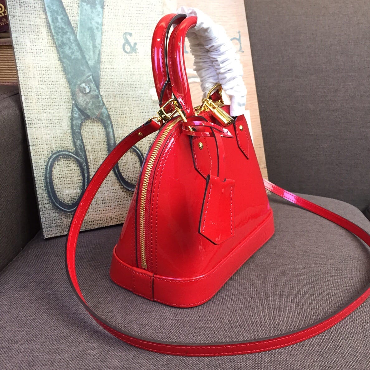 ALMA BB 贝壳挎包 M91678 此款Alma BB手袋源于1934年设计的路易威登经典包款,2010年,在Alma包款正式推出20年之际,特为拥有此款手女士的女儿设计迷你型号,并赋予Alma 更为年轻的精神。这款采用光亮的Monogram Vernis制成的迷你款手袋可轻松装纳钥匙、钱包、手机及唇膏等物品。Alma BB手袋配有一根可拆卸的背带,用于轻便斜挎。-可拆卸肩带,可手提或肩背-双拉链开合,取物更方便-1个扁平内袋-底部金属铆钉保护手袋-size24*12*18??