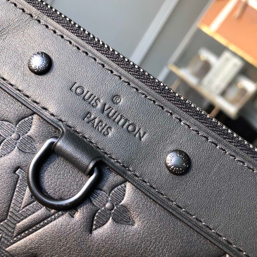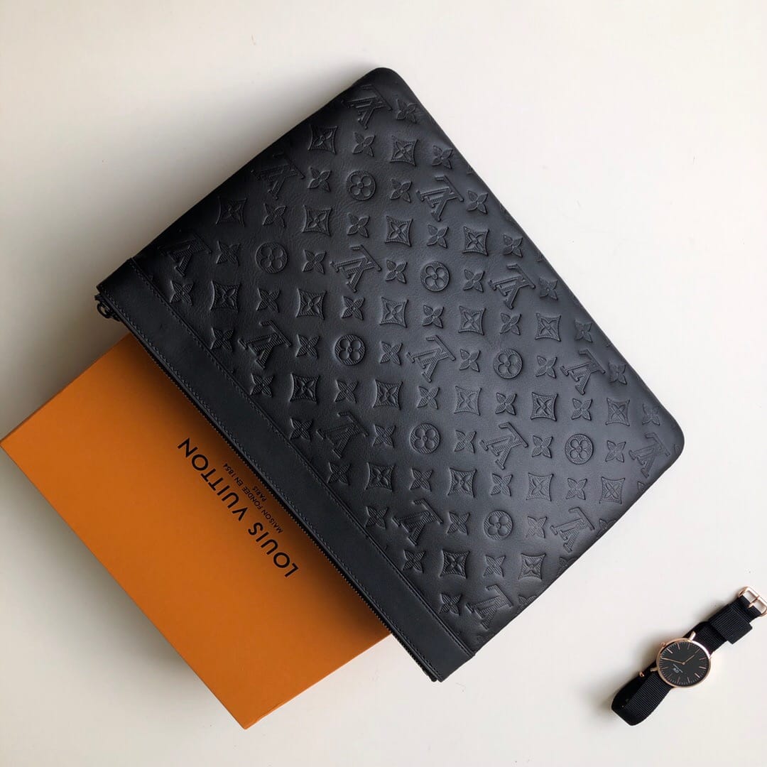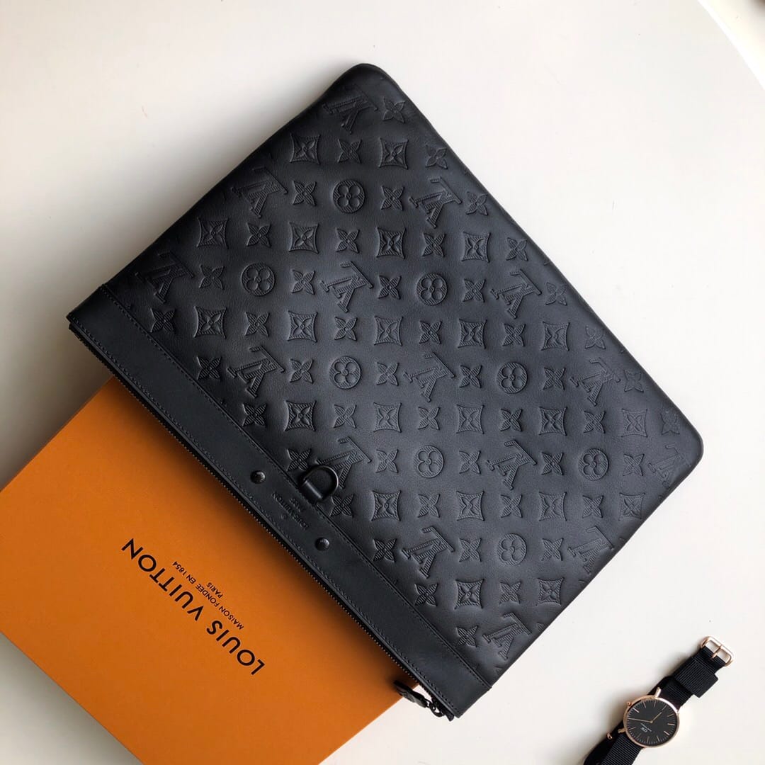 原单~?M62903 黑色 压花 POCHETTE APOLLO 手袋 此款Pochette Apollo手袋由格外柔软的黑色Monogram Shadow小牛皮裁制而成,饰有标志性的路易威登Monogram压纹,是携带文件等私人物品的优雅之选。造型清爽简洁,配有D形环,既可单独携带,亦可装入其他包袋中。34.0 x 25.0 x 2.0 cm (长 x 高 x 宽)。