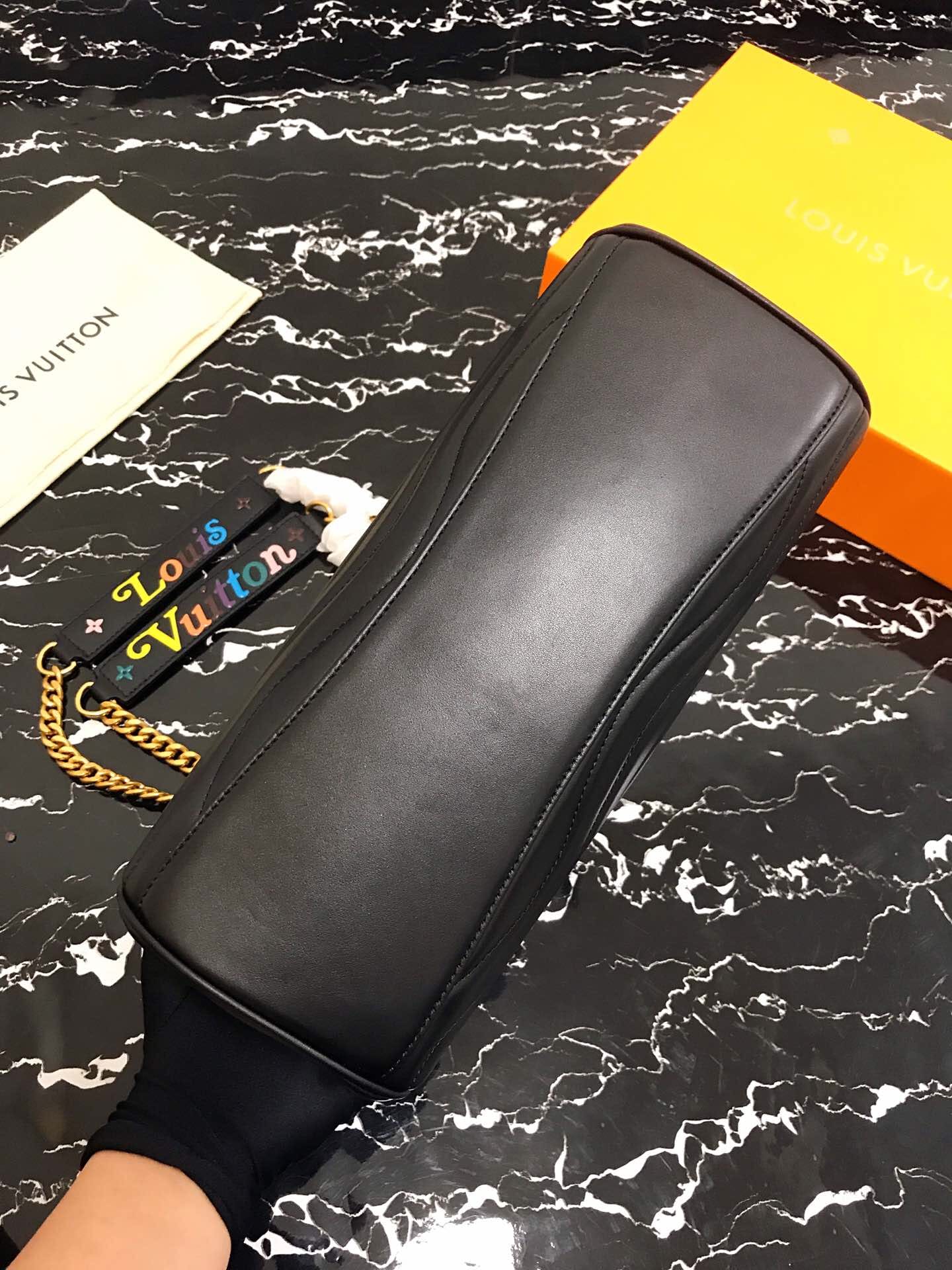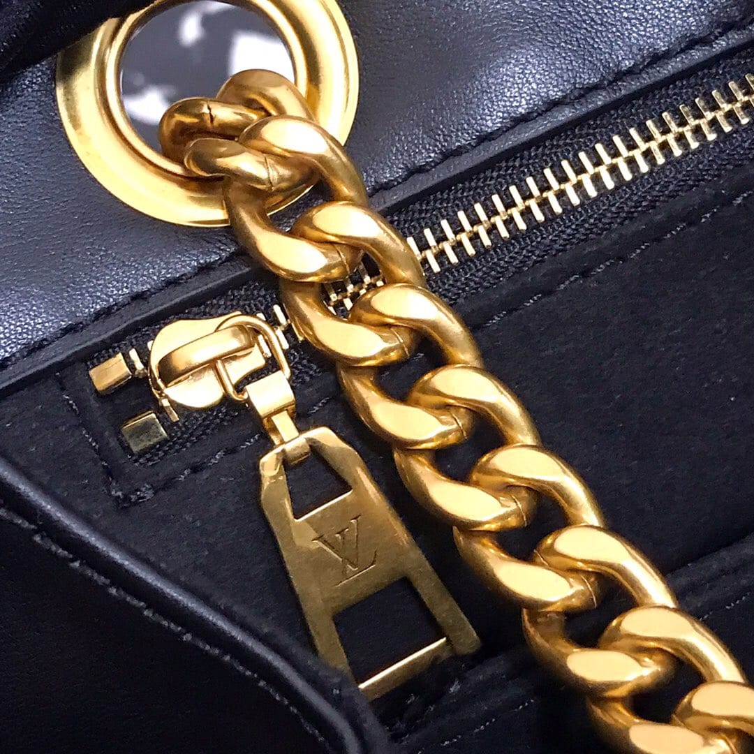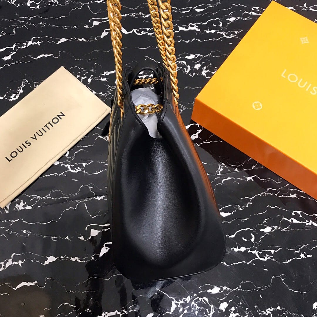 独家实拍!(顶级原单)NEW WAVE TOTE 手袋 M51496黑色 由柔软小牛皮裁制而成、新潮又实用的New Wave Tote 手袋:奢华的绗缝设计,做旧质感的金属饰件,轻松存放日常用品,同时帮助打造时髦造型。质量轻盈、触感舒适,配有滑动式包链手柄,长度可调节,便于肩背。尺寸:32x22x13cm