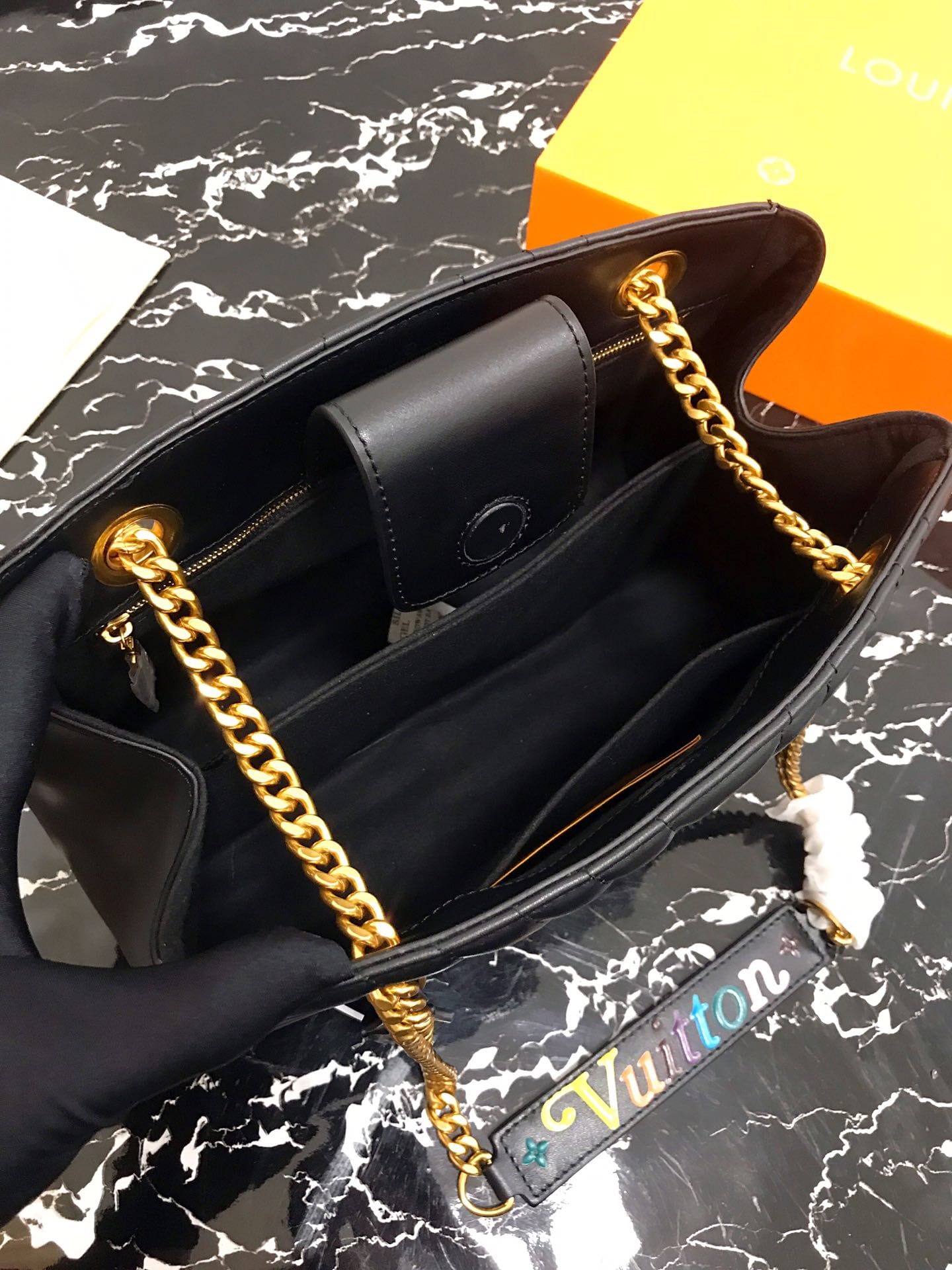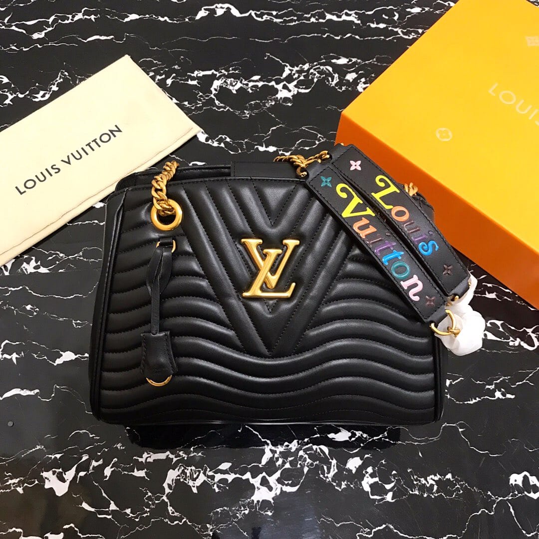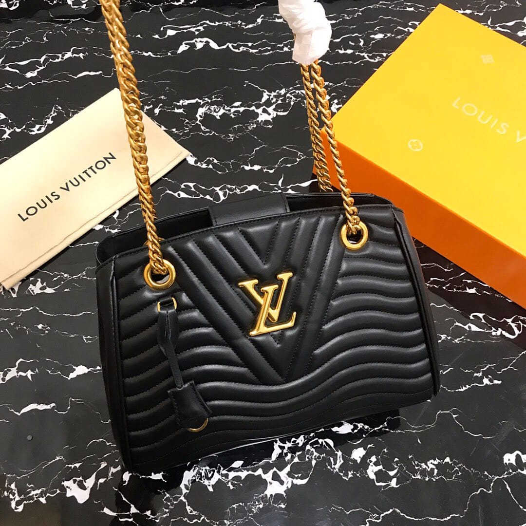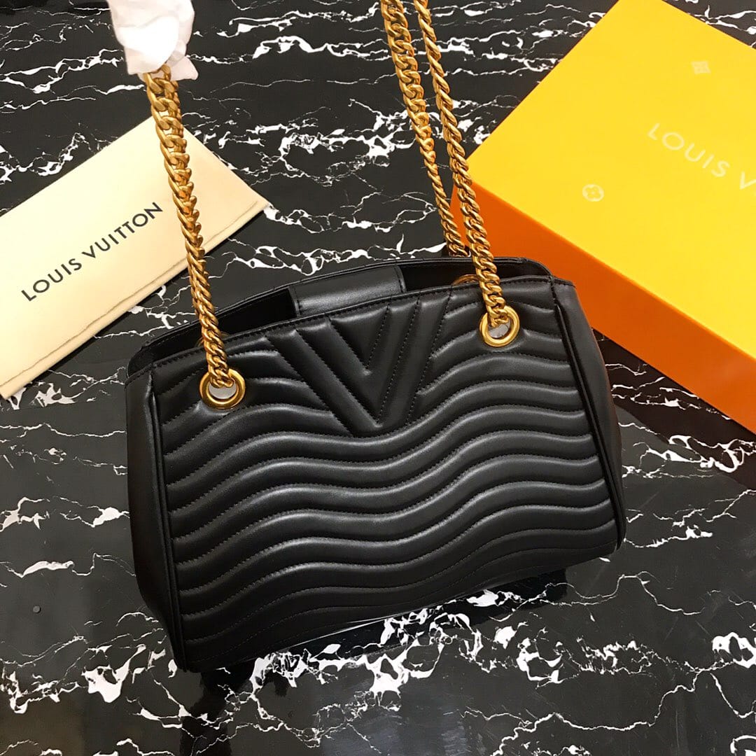 独家实拍!(顶级原单)NEW WAVE TOTE 手袋 M51496黑色 由柔软小牛皮裁制而成、新潮又实用的New Wave Tote 手袋:奢华的绗缝设计,做旧质感的金属饰件,轻松存放日常用品,同时帮助打造时髦造型。质量轻盈、触感舒适,配有滑动式包链手柄,长度可调节,便于肩背。尺寸:32x22x13cm