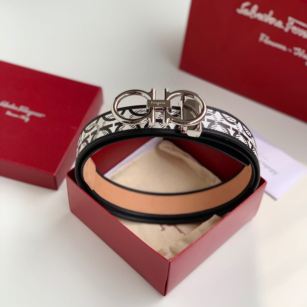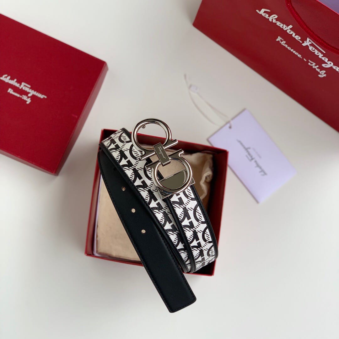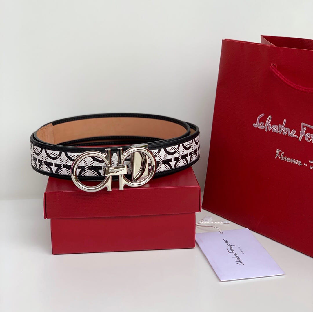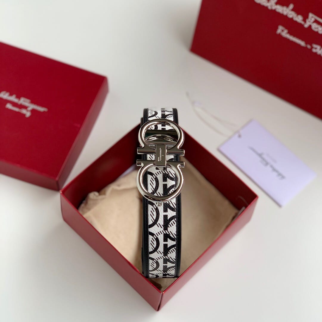 {菲拉格慕}男士皮带!男款—主题系列 皮带采用柔软皮革材质 缀有提花面料标识饰片 精致的双色图案充分契合本季主题风格 配以亮白金属扣头更显时髦 长度可调节?宽度:3.5