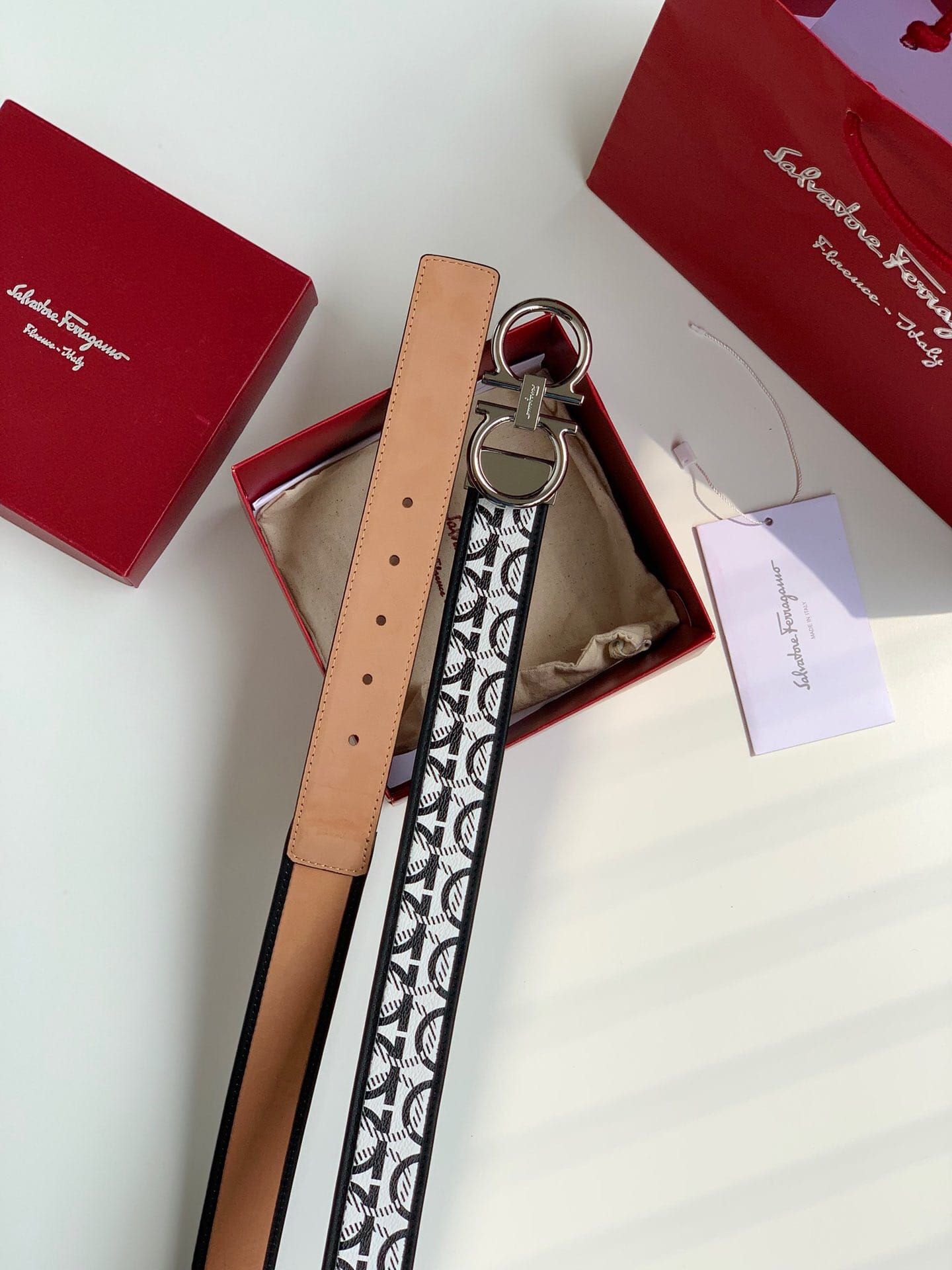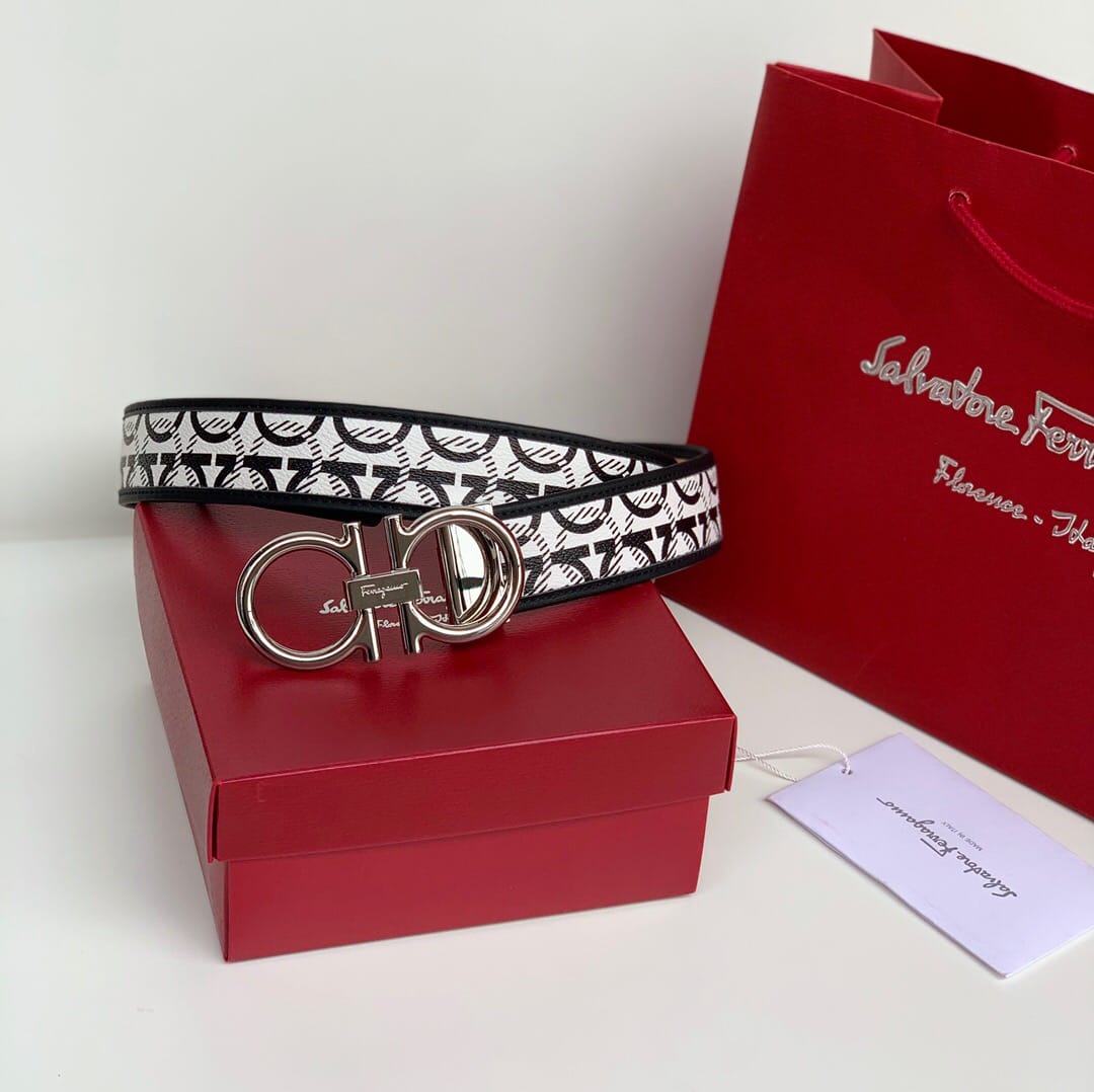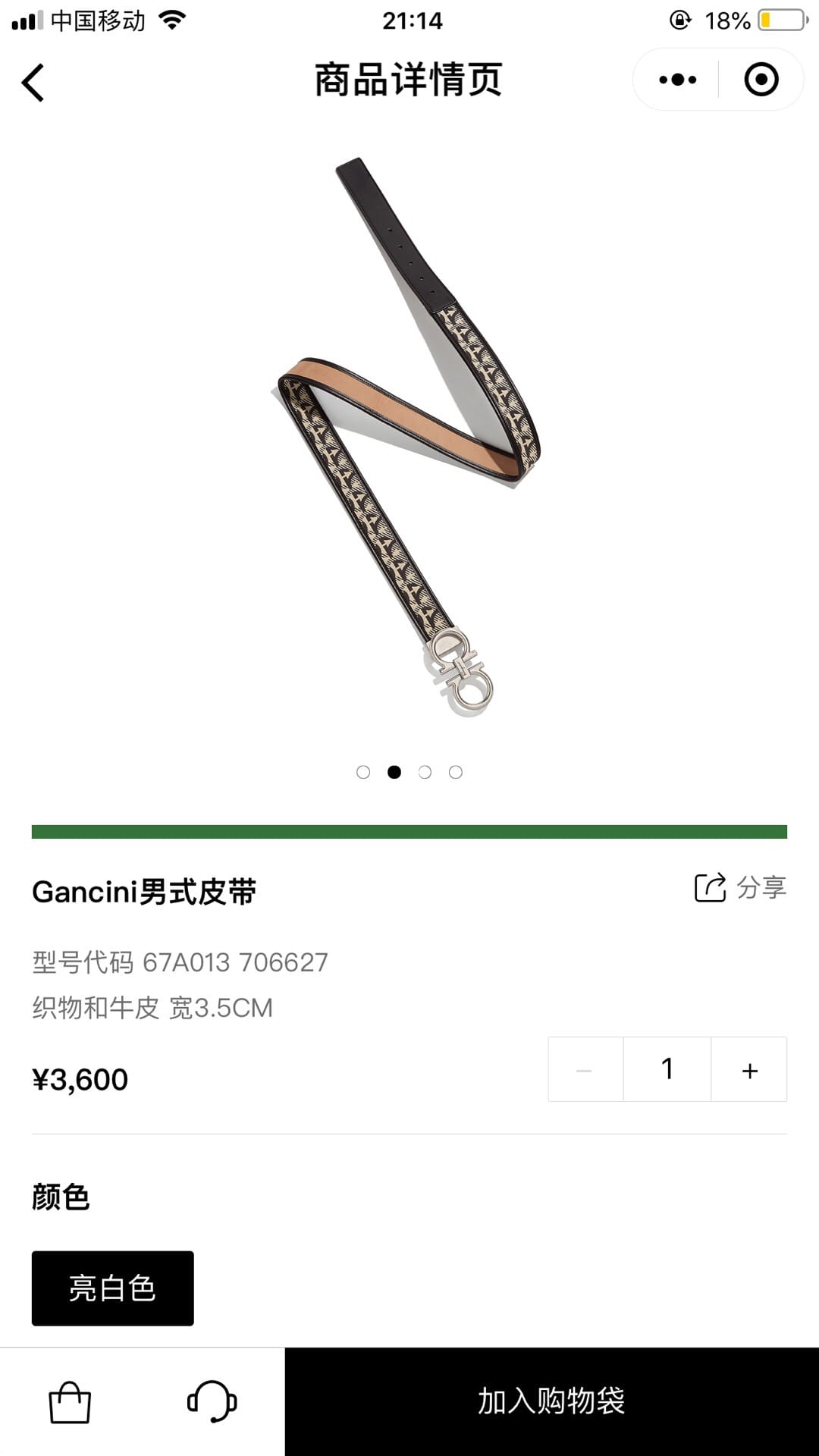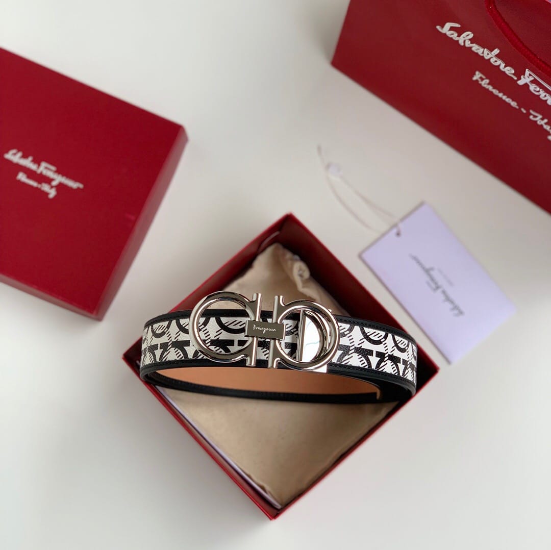 {菲拉格慕}男士皮带!男款—主题系列 皮带采用柔软皮革材质 缀有提花面料标识饰片 精致的双色图案充分契合本季主题风格 配以亮白金属扣头更显时髦 长度可调节?宽度:3.5