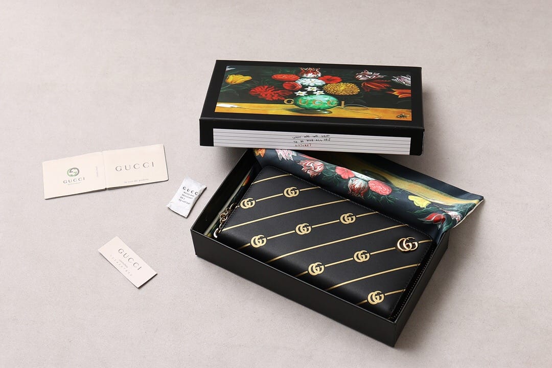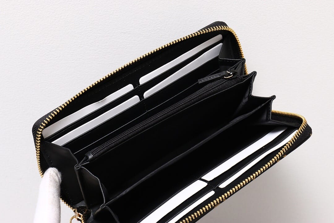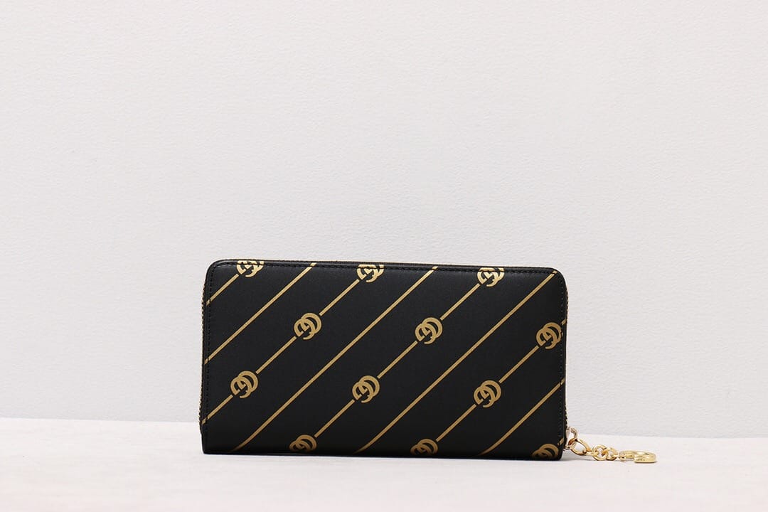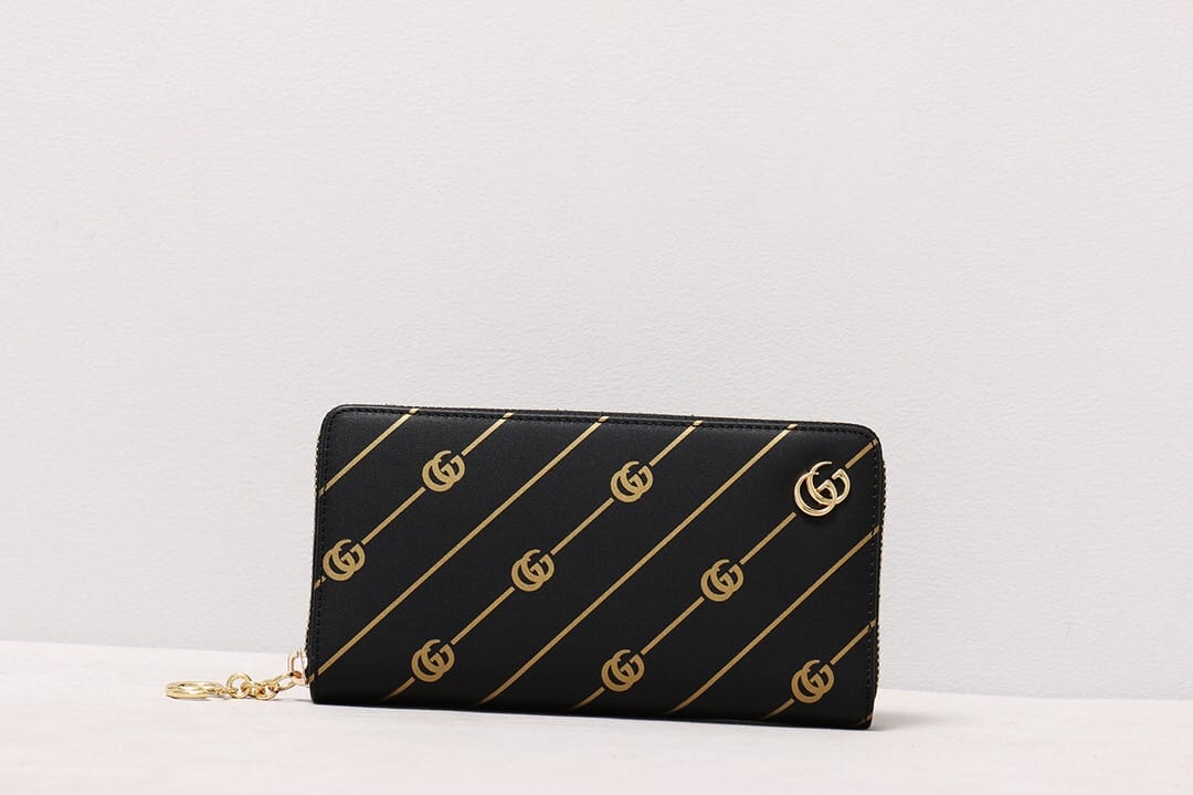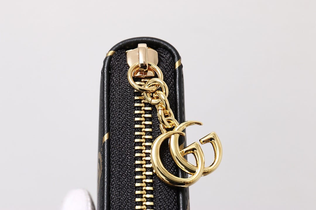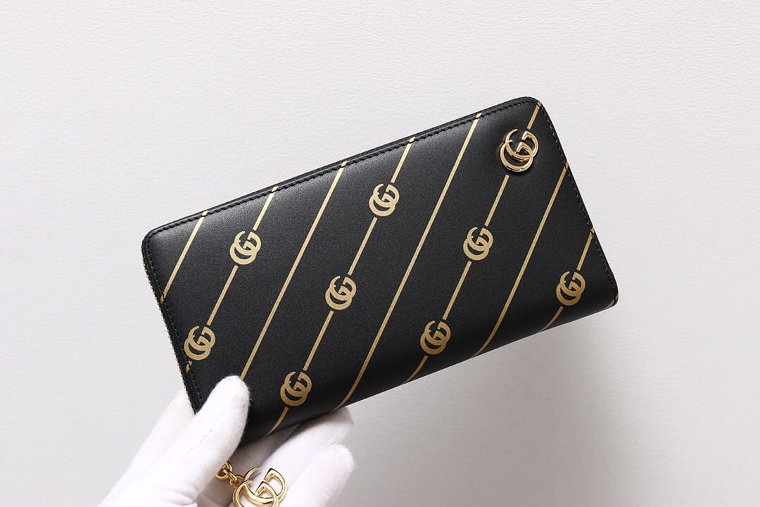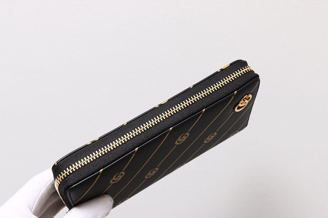 G家最新款黑色皮革全拉链钱包?饰以双G条纹印花,金属质感金色