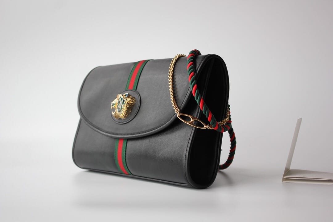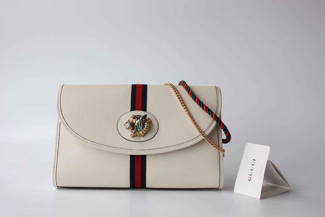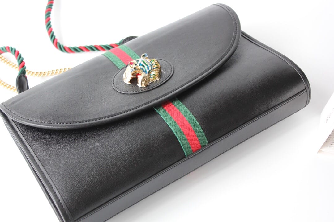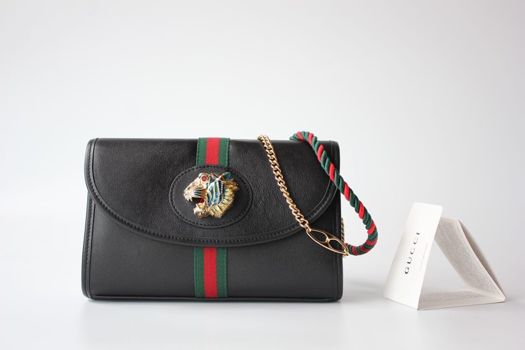 型号??564697大号 等级??真正最高原单品质 尺寸?32.5x21x6cm 简介??出货啦??作为2019春夏Rajah系列的新成员,中号皮革肩背包上点缀本系列标志性的彩色珐琅和水晶虎头造型,创意灵感源自珠宝时尚设计师Hattie Carnegie于1940年代推出的典藏之作。双带式设计,配有一条短链带和一条品牌标志性红绿织带配色长肩带