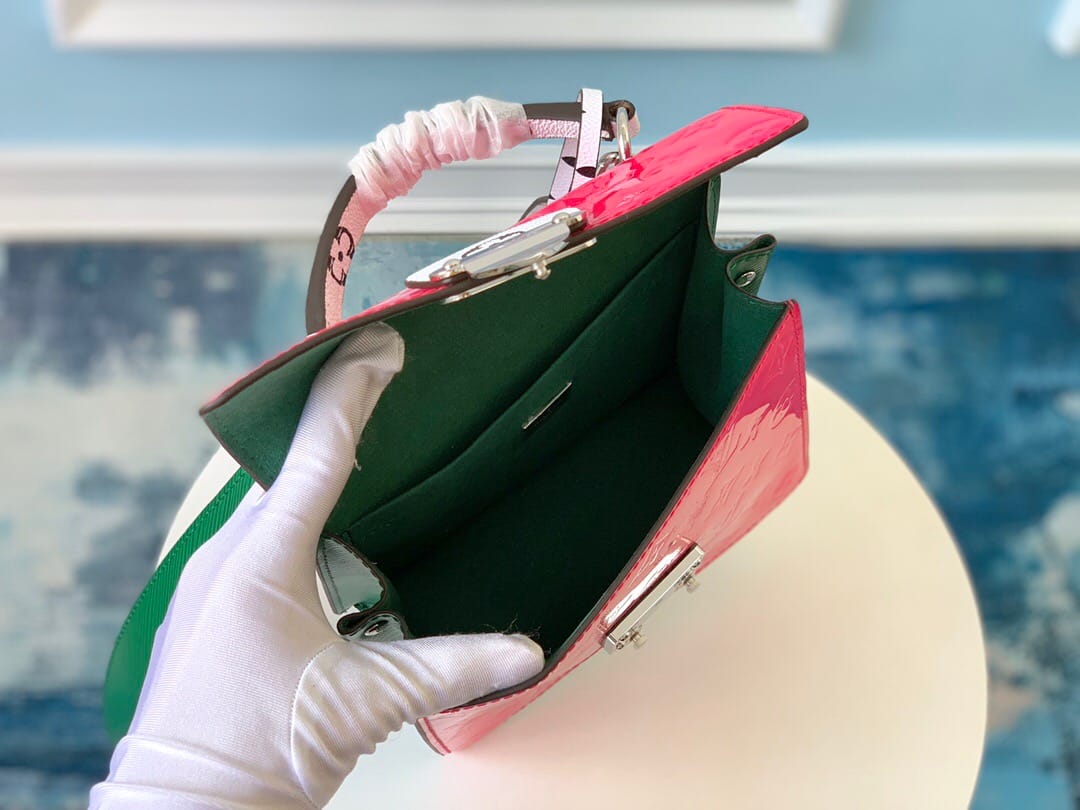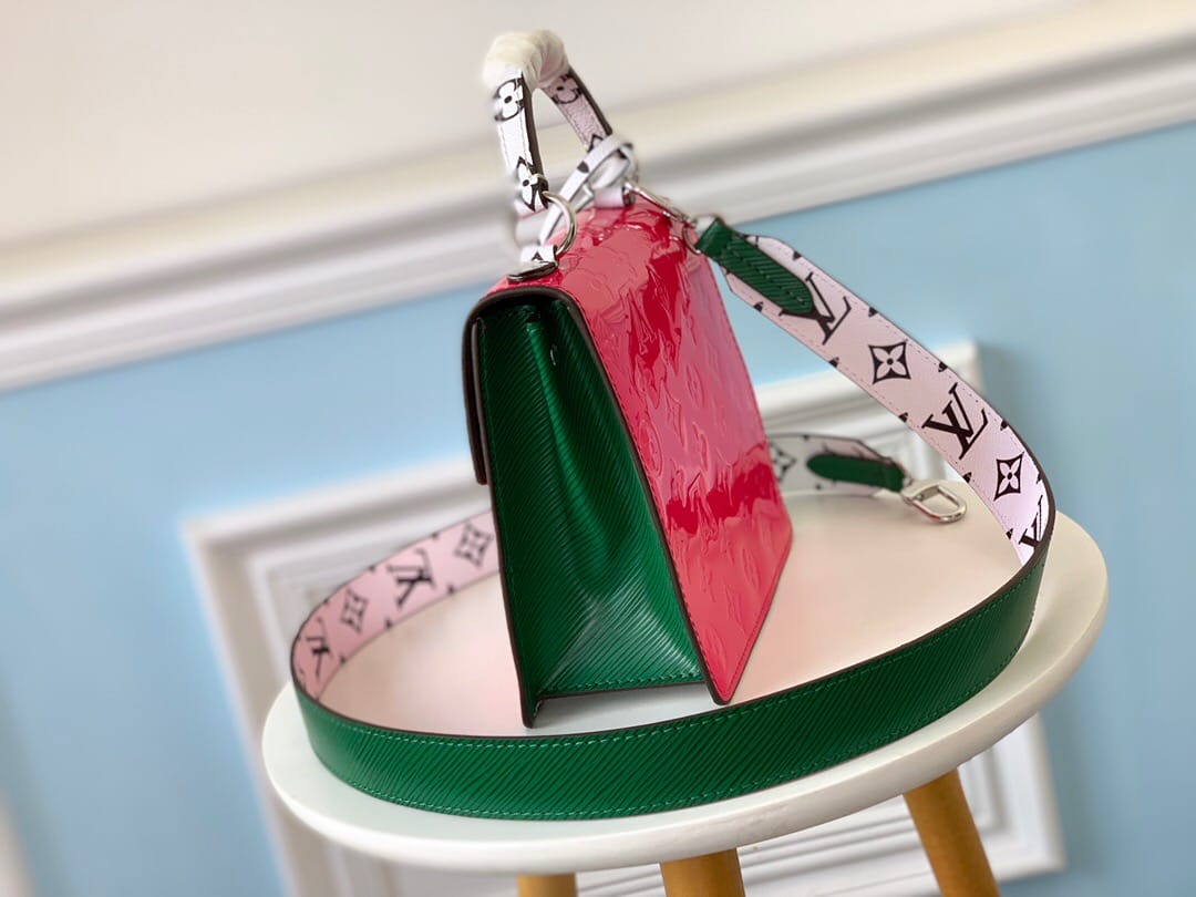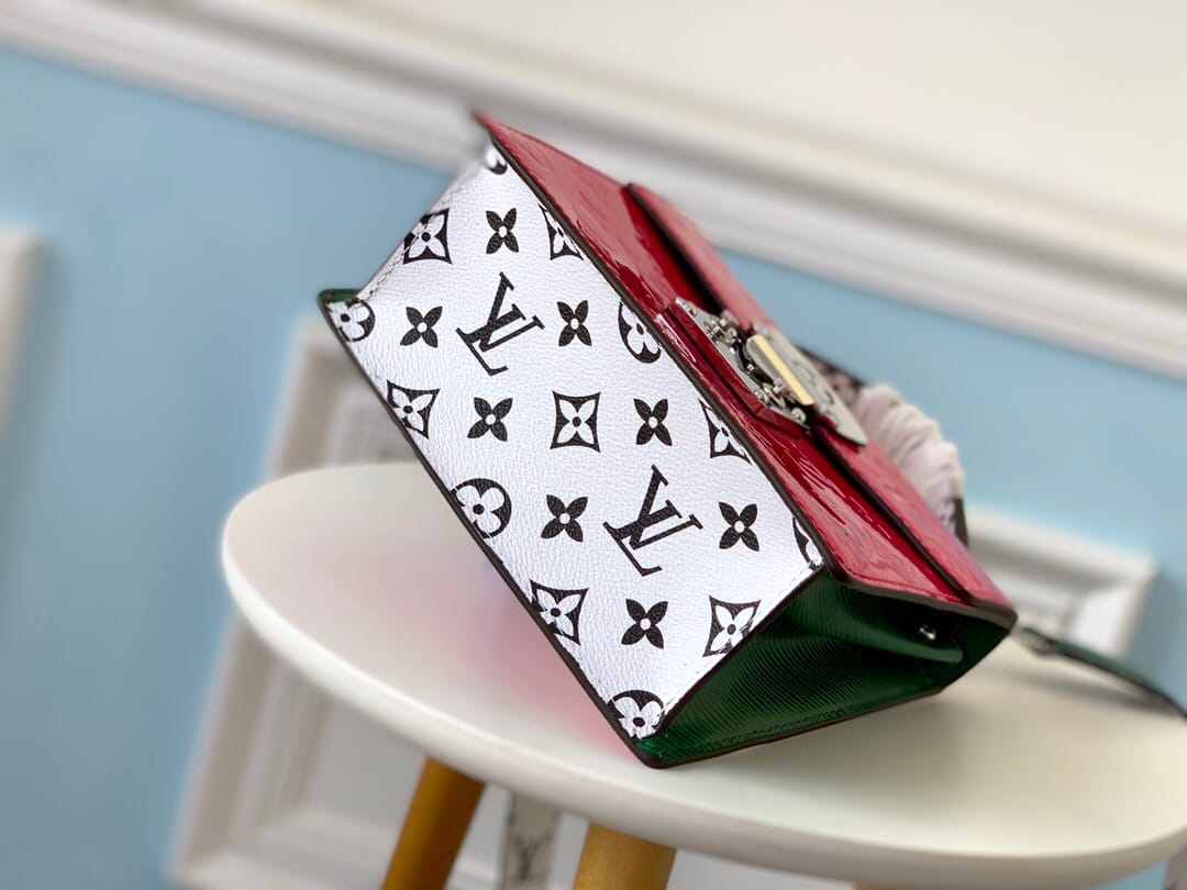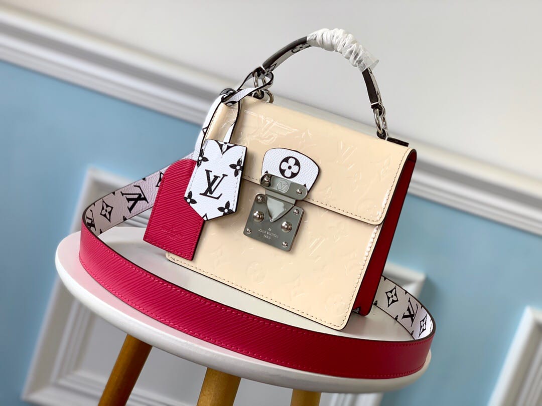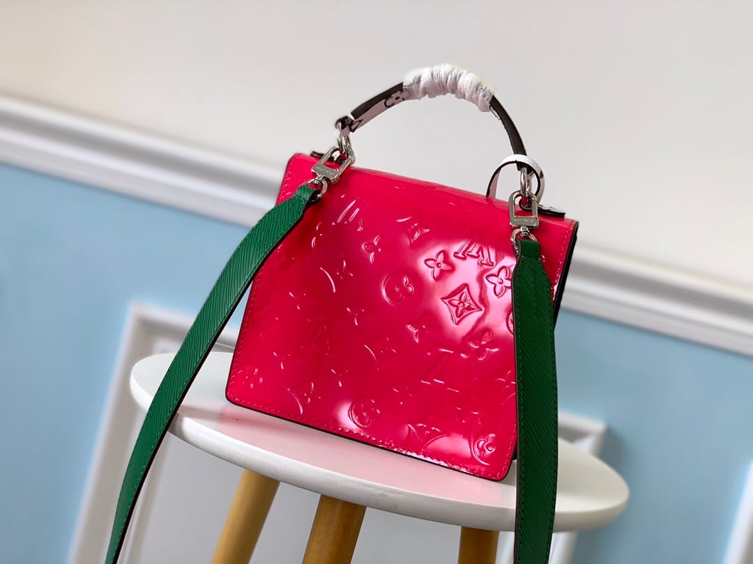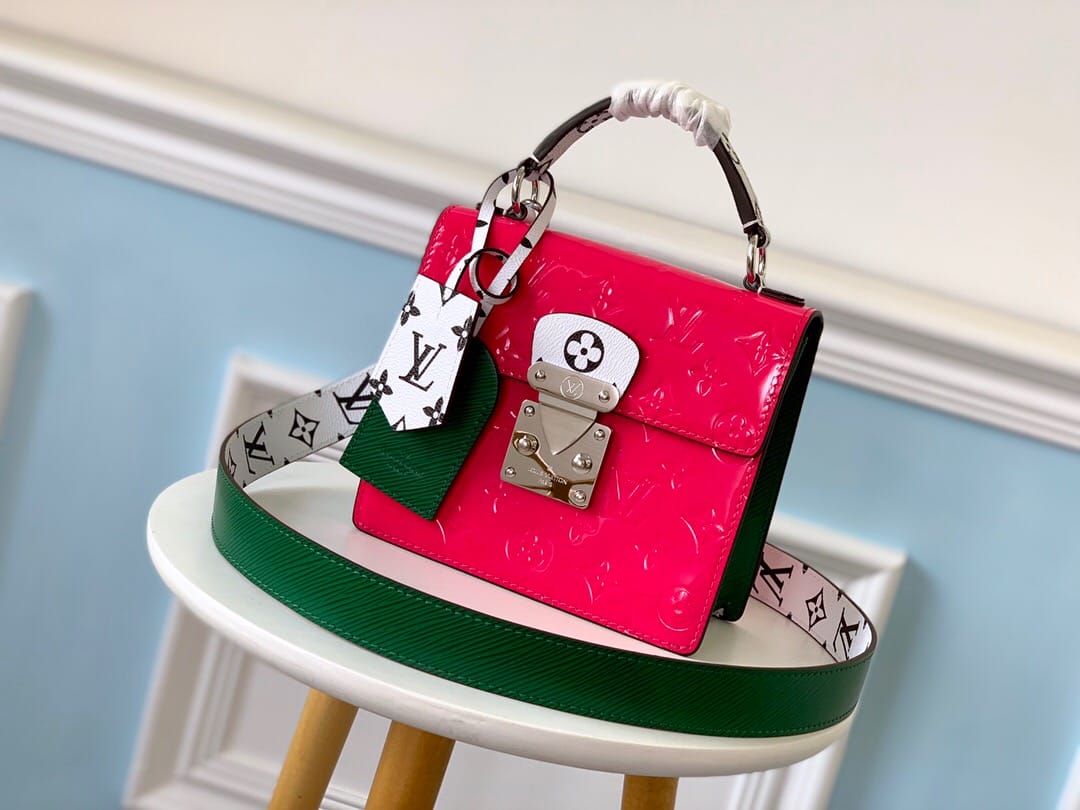 SPRING STREET 手袋M90376梅红色此款Spring Street手袋采用Monogram Vernis漆面牛皮,风格百搭。以原女装艺术总监于1999年推出的设计为灵感,运用对比色标志性面料,打造出利落而前卫的格调。顶部手柄与可拆卸肩带带来多种背携选择。尺寸:17.0 x 16.0 x 8.5 cm