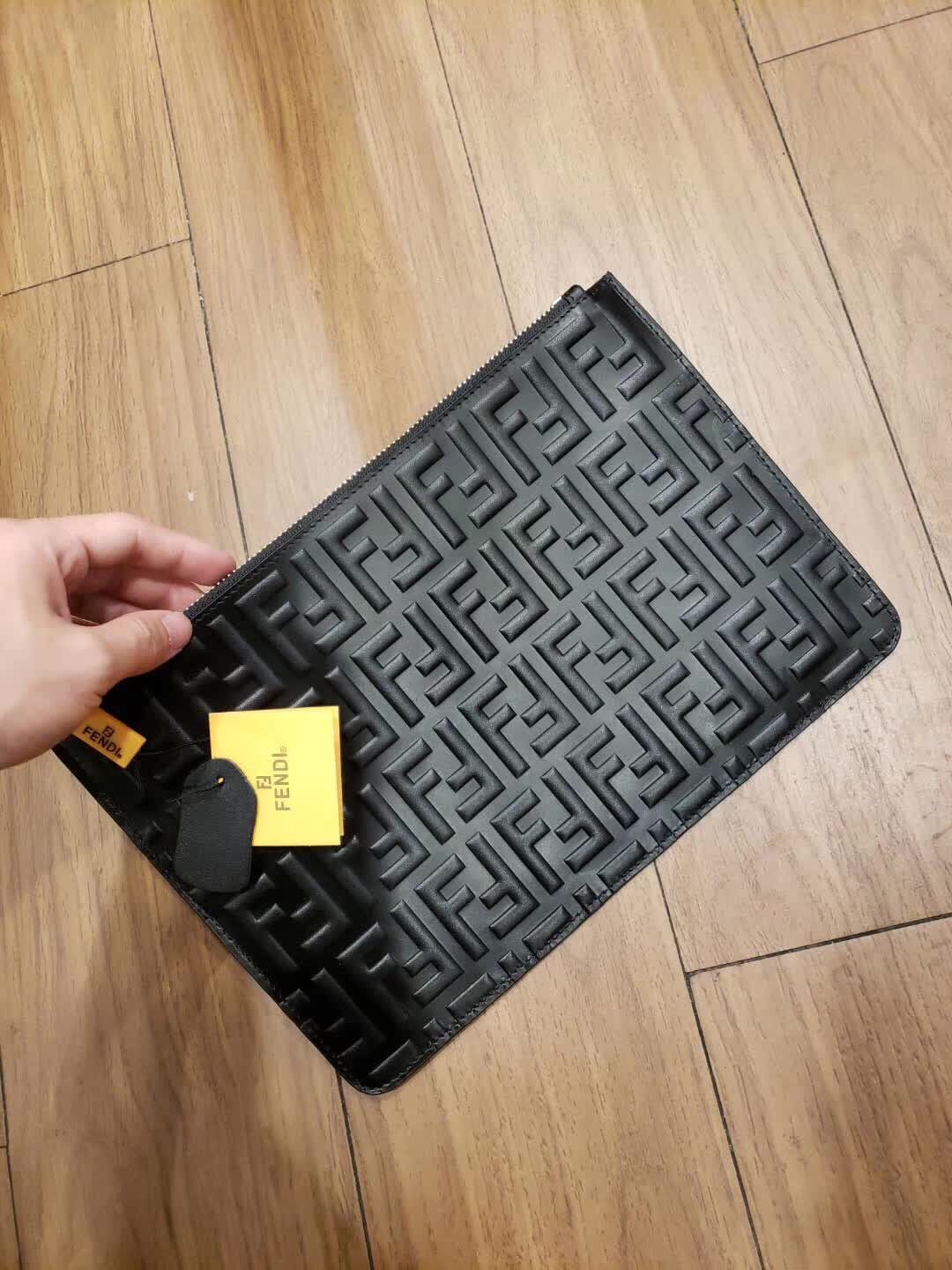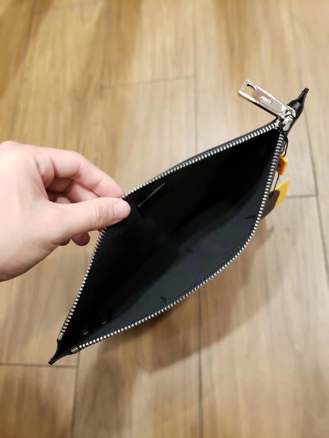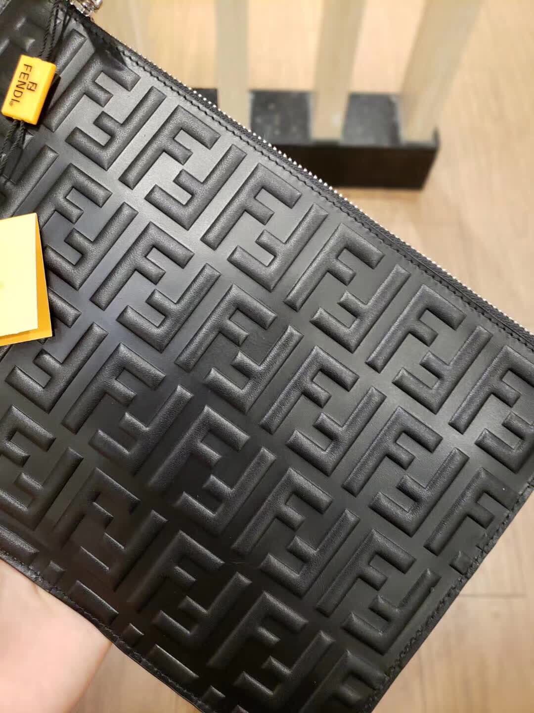 FENDI 芬迪 拉链开合薄手拿包。黑色小牛皮制作。缀以双F