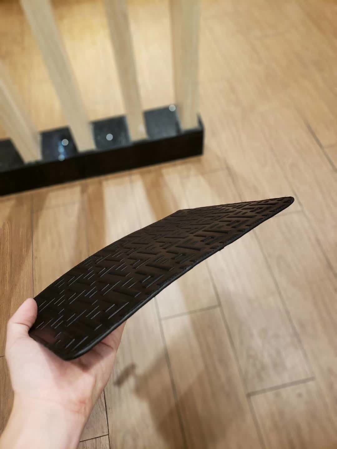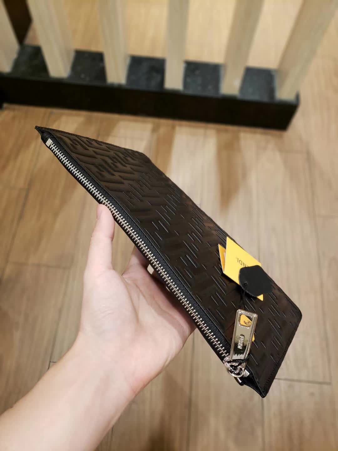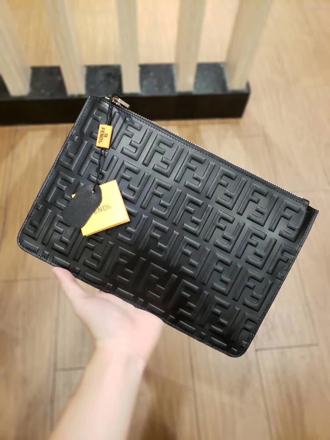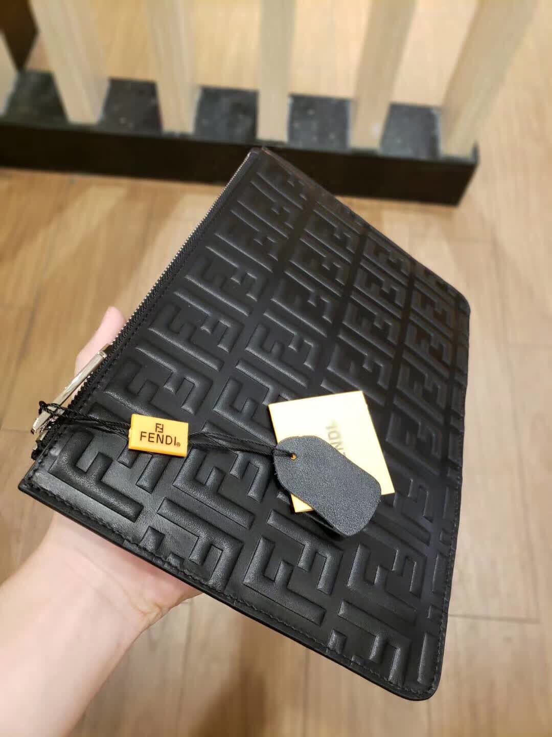 FENDI 芬迪 拉链开合薄手拿包。黑色小牛皮制作。缀以双F