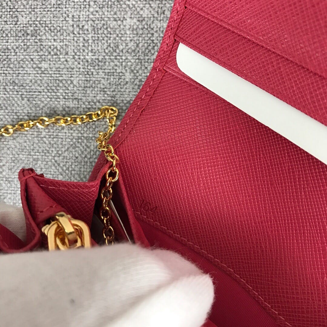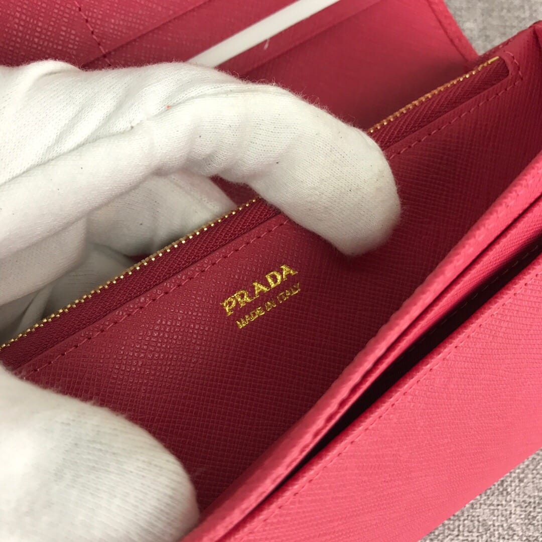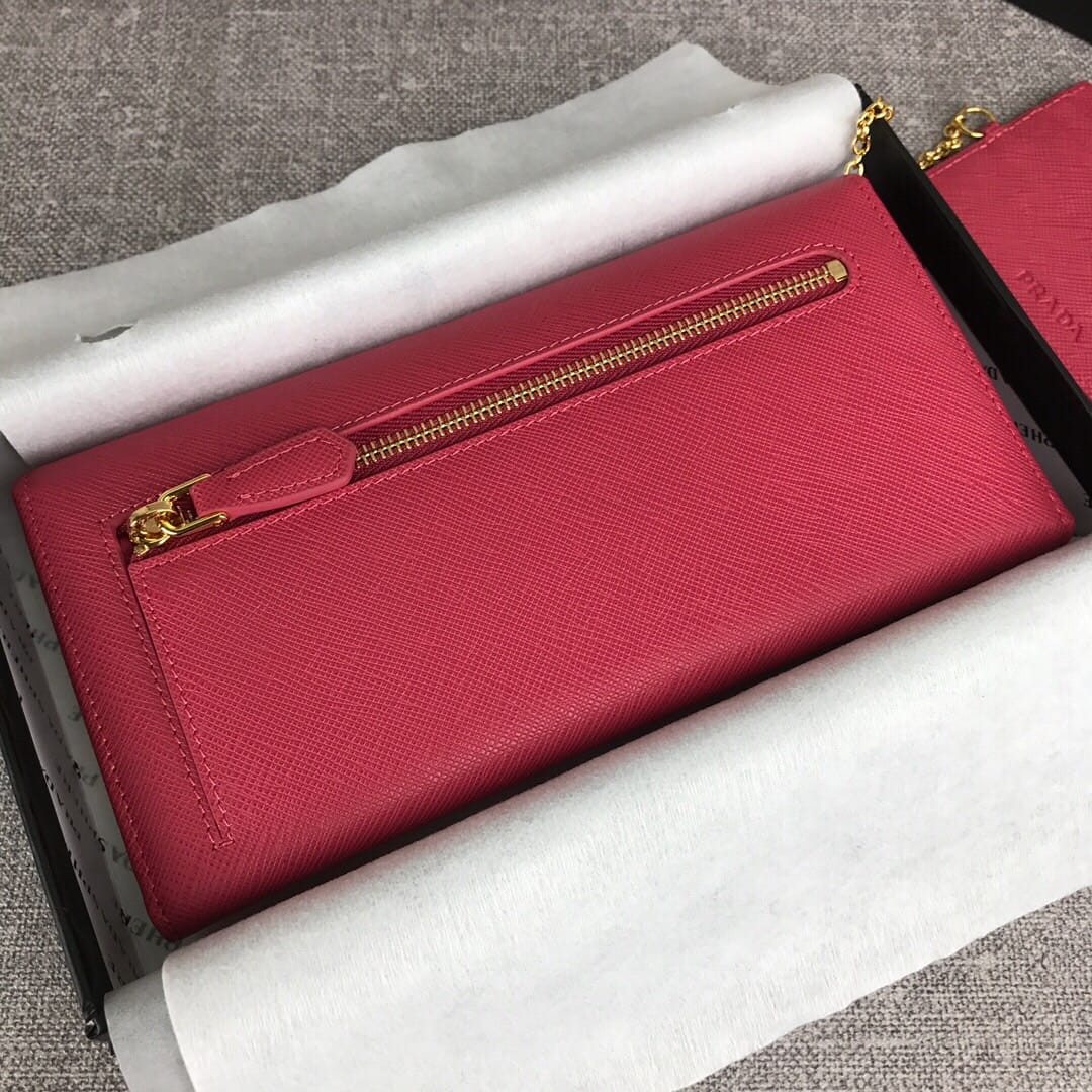 【原单代购级】PRADA经典爆款女士翻盖钱夹?配链条和两个信用卡插袋的可拆卸证章夹,官网同步,正品开发,型号1MH132,颜色:玫红/散字唛,内码164代工码? 意大利顶级原单十字纹牛皮质感极好,进口螺纹里布 进口镀金金属五金配件!精湛走线均匀整齐,做工精湛如图可见 品质媲美正品,尺寸:长18.7cm高9.5cm【配原单包装盒身份证卡片编号可扫码】