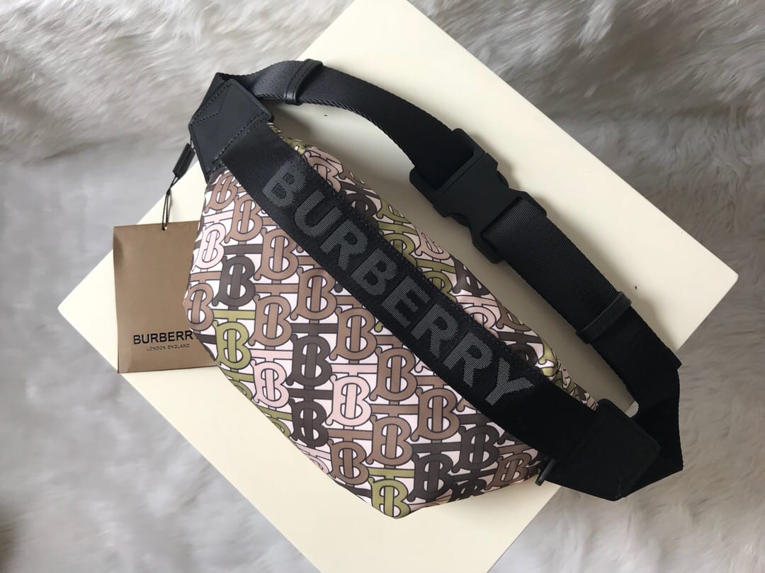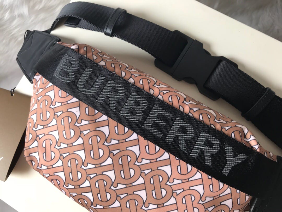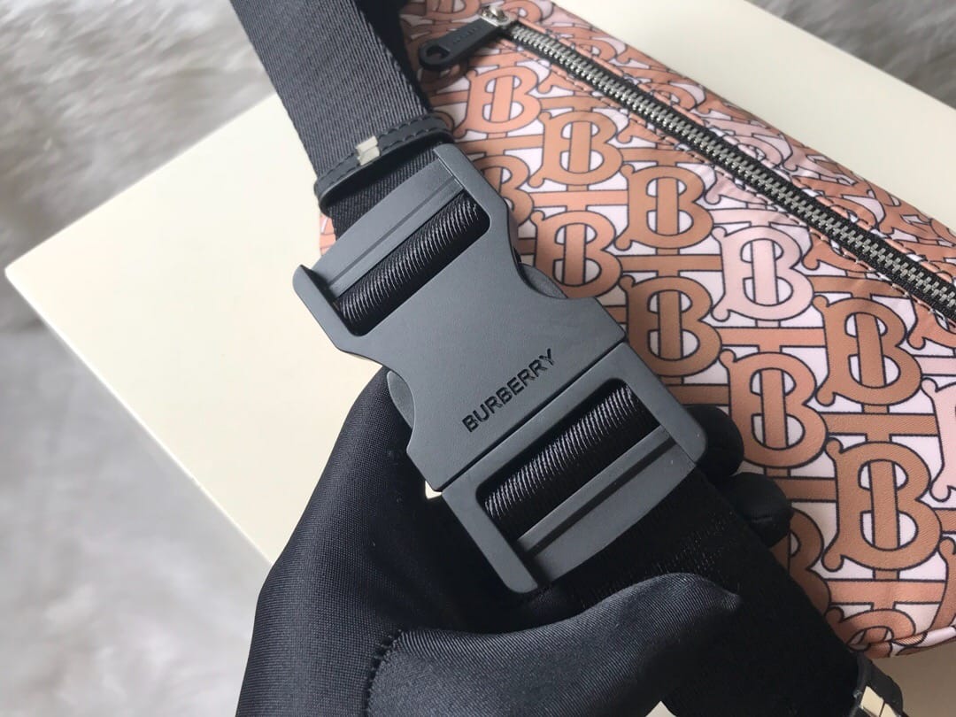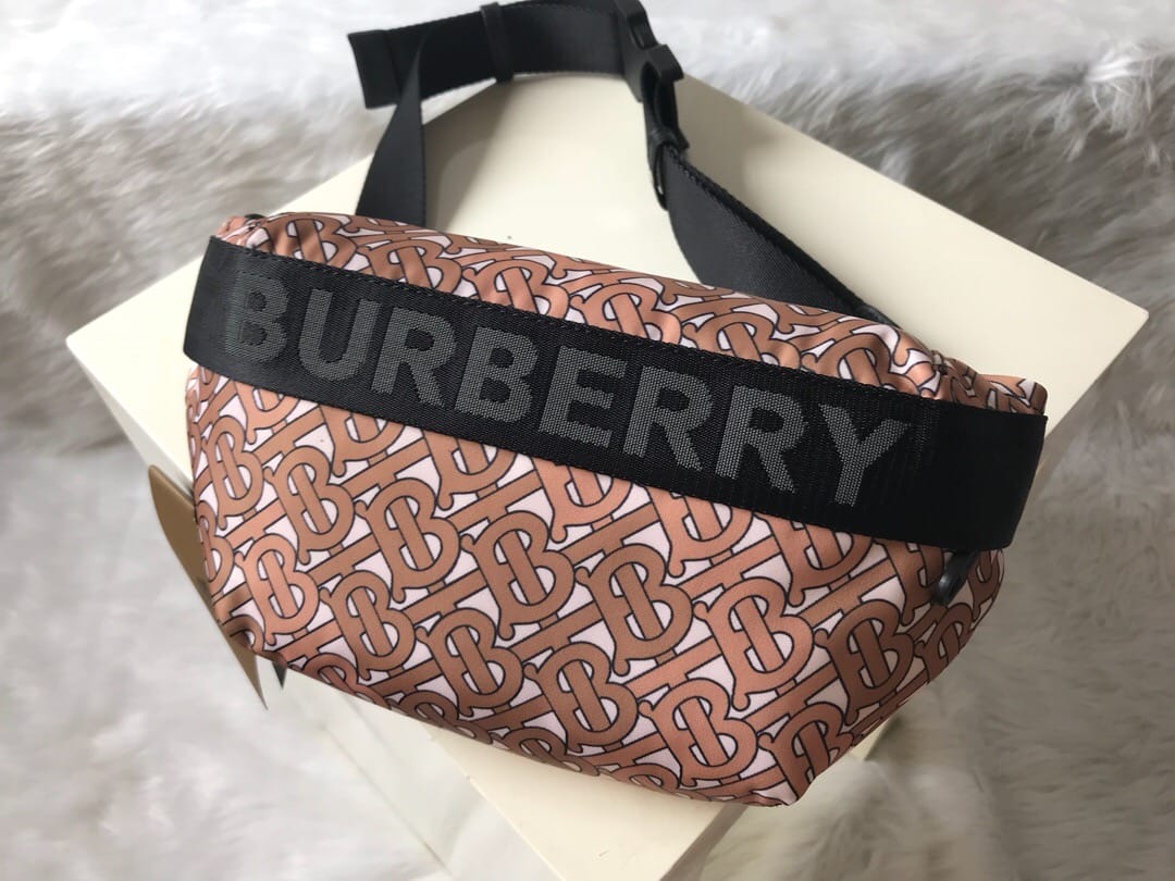 BURBERRY 借鉴九十年代街头风格,选用尼龙材质打造,装饰提花精纺品牌徽标,搭配精美皮革边饰。可用背带斜挎或系于腰部。颜色:啡色 尺寸:31×7.5×16cm??