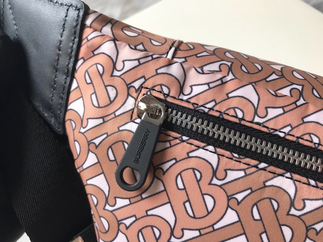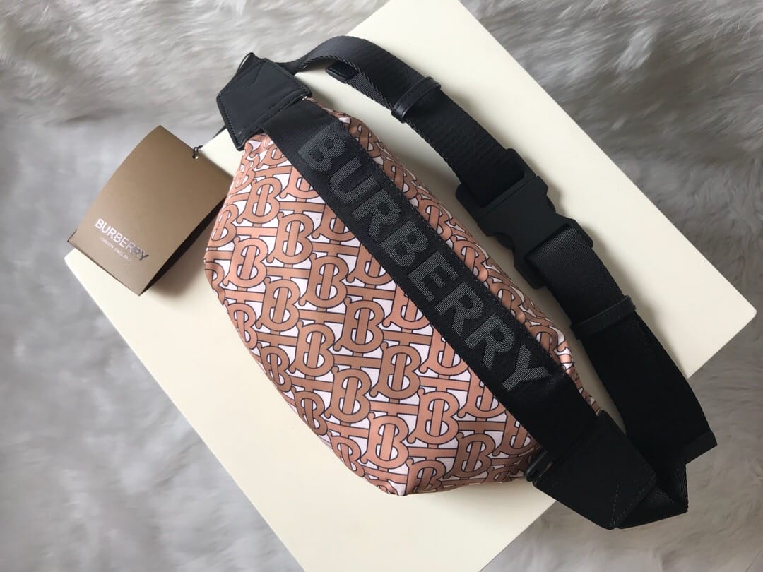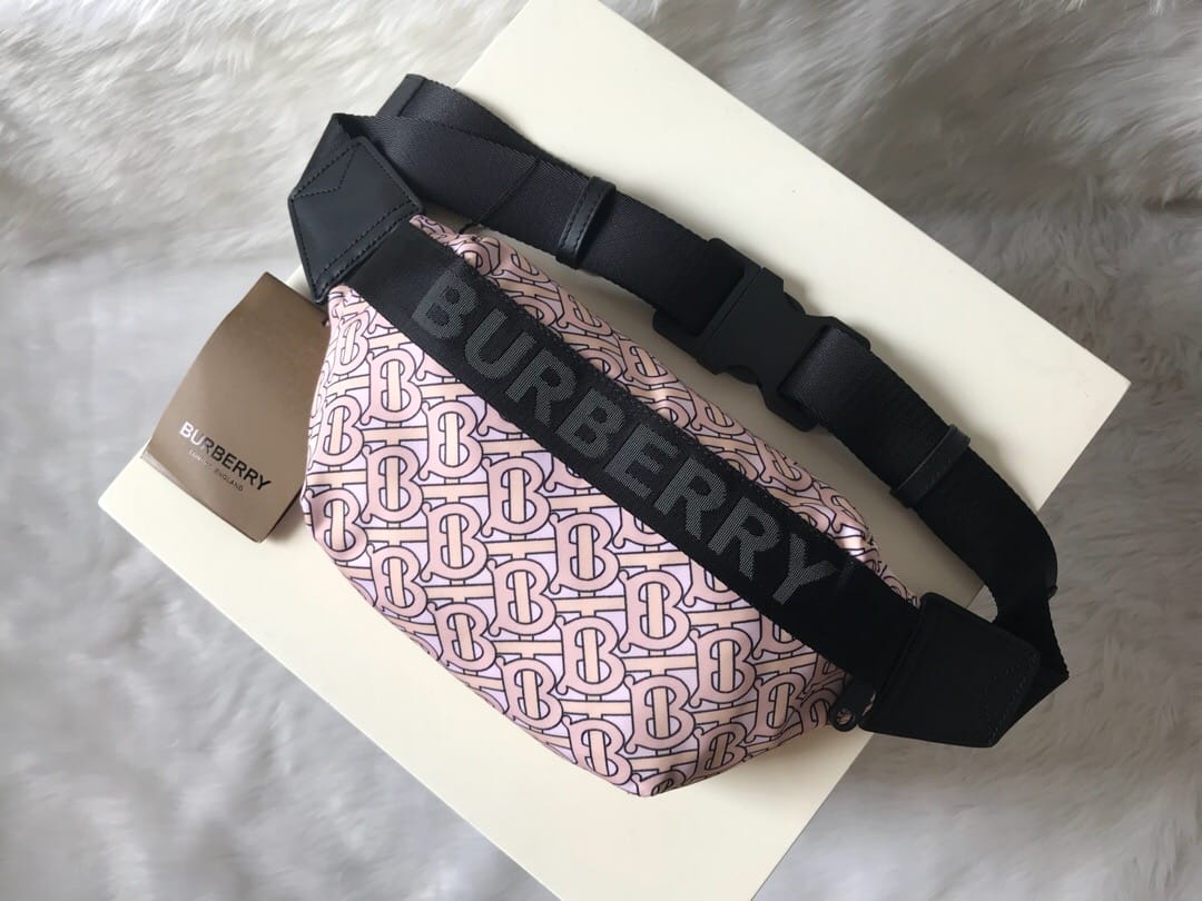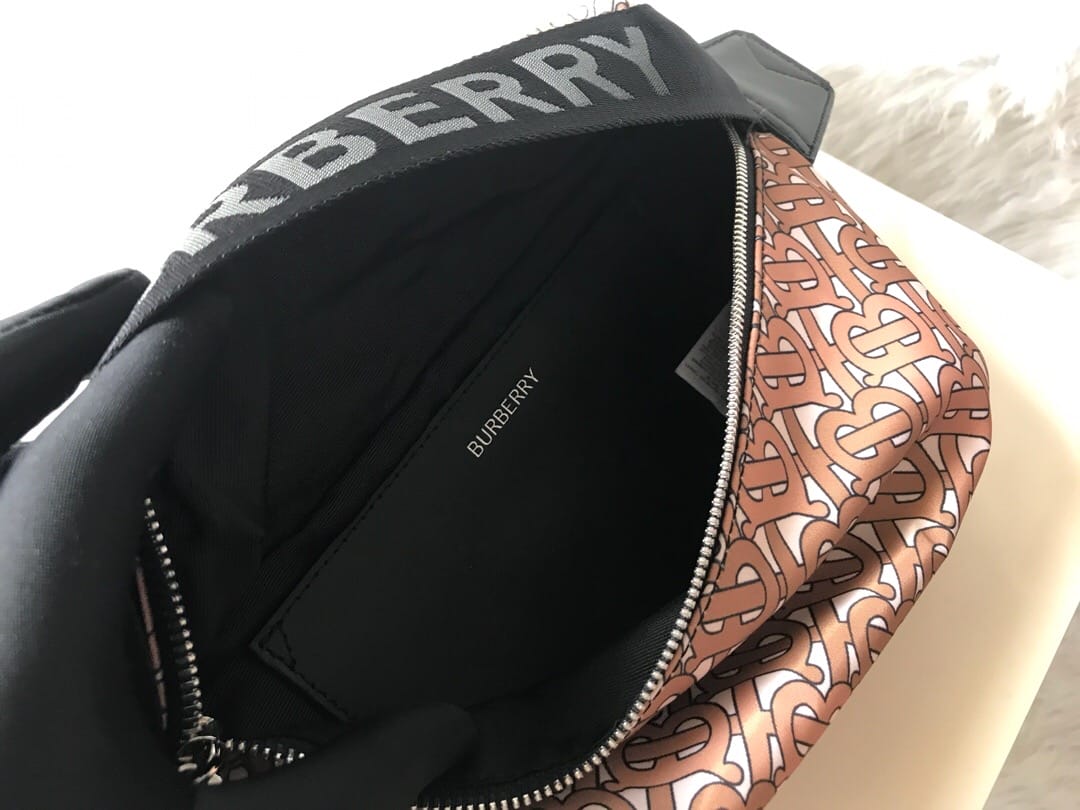 BURBERRY 借鉴九十年代街头风格,选用尼龙材质打造,装饰提花精纺品牌徽标,搭配精美皮革边饰。可用背带斜挎或系于腰部。颜色:啡色 尺寸:31×7.5×16cm??