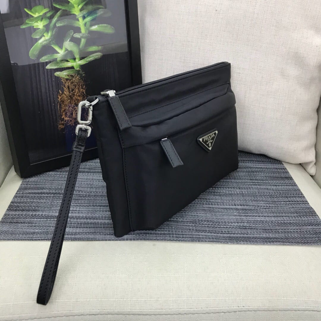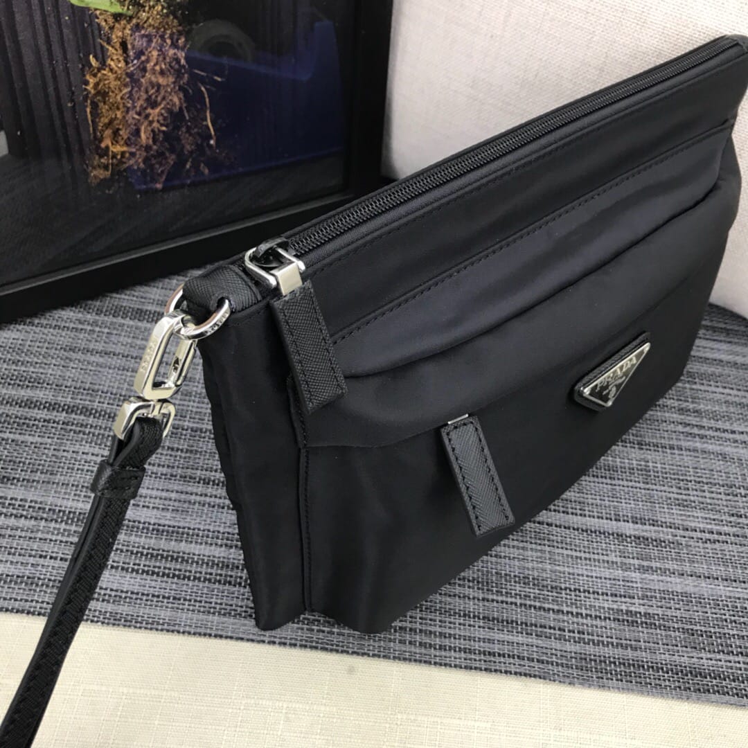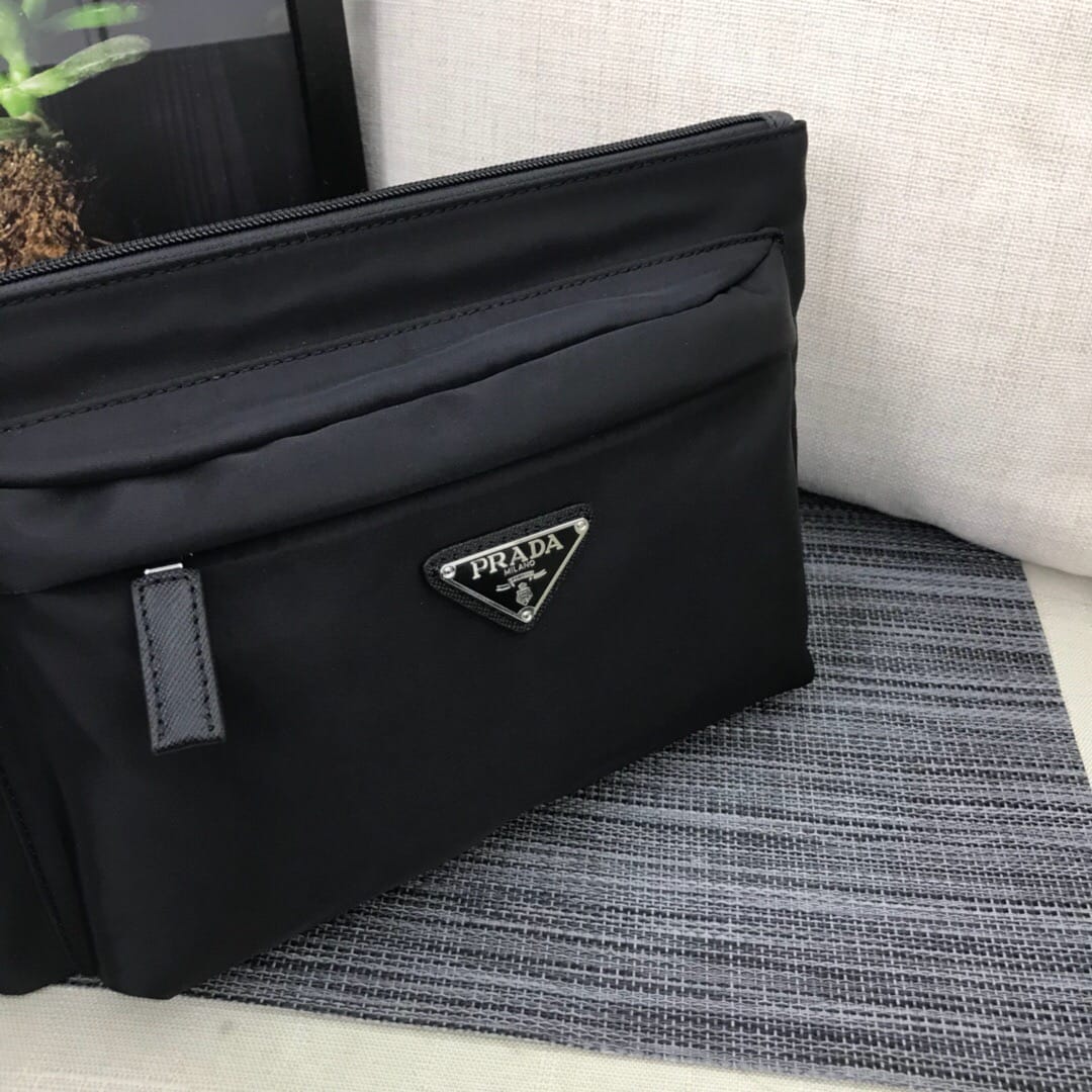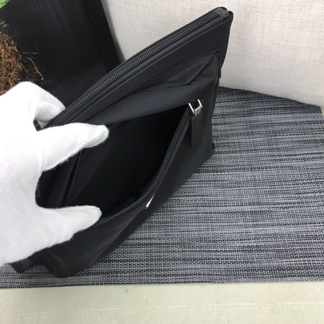 新款???2NH007、三角唛标.采用进口尼龙材质/牛皮,内口袋有六个卡位,尼龙衬里,可拆卸皮革手腕带,抛光钢质金属配件???175代工码,轻便又时尚???,长28x高18cm