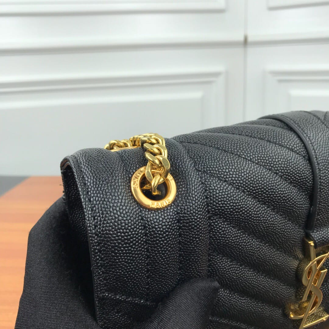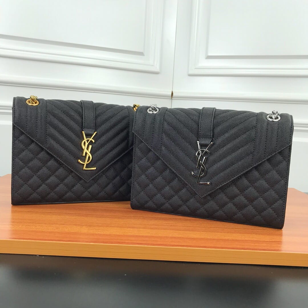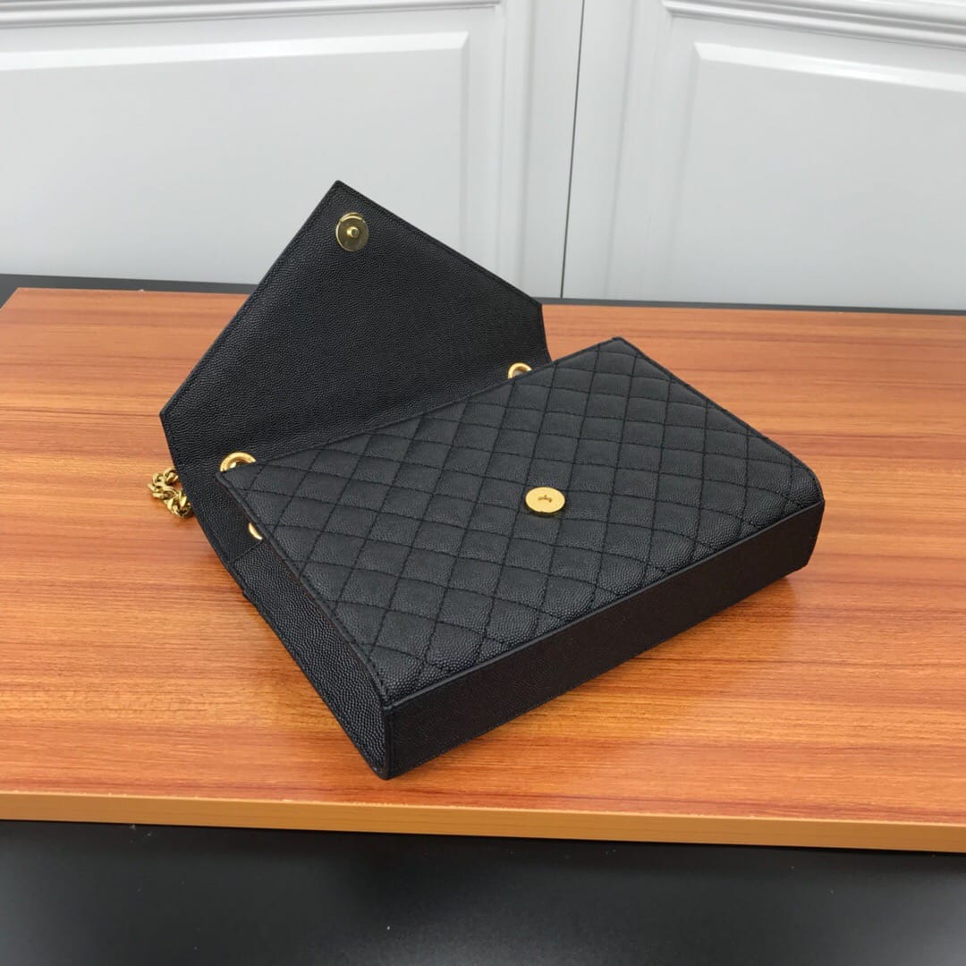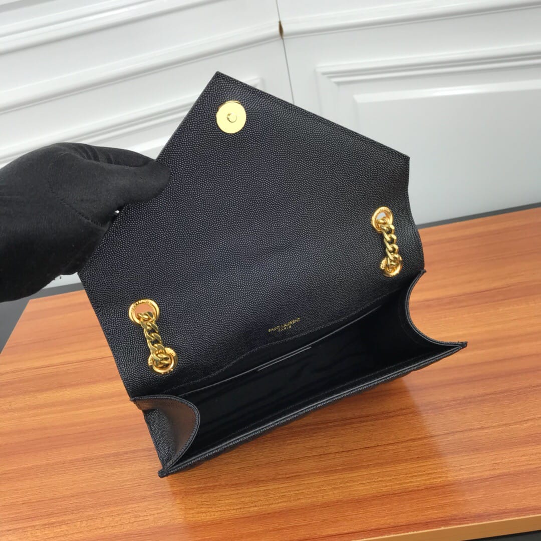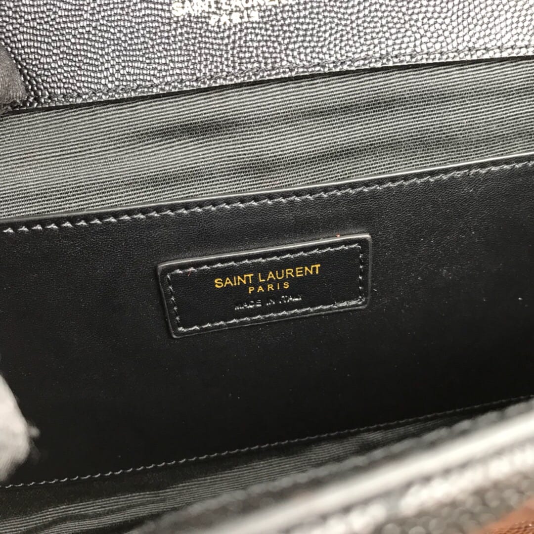 SAINT LAURENT 标志正面翻盖包,配有金属联结 YSL 标志、真皮链条肩带及纵横绗缝拼接。尺寸24.0 17.5 6.0 CM 100% 小牛皮 罗缎衬里 折叠后肩带长度:26.5厘米,肩带长度:55厘米;肩带可缩短,呈现长肩风格 磁性四合扣封口 拉丝银色调金属五金 背面外插袋 1个插袋 型号:487206