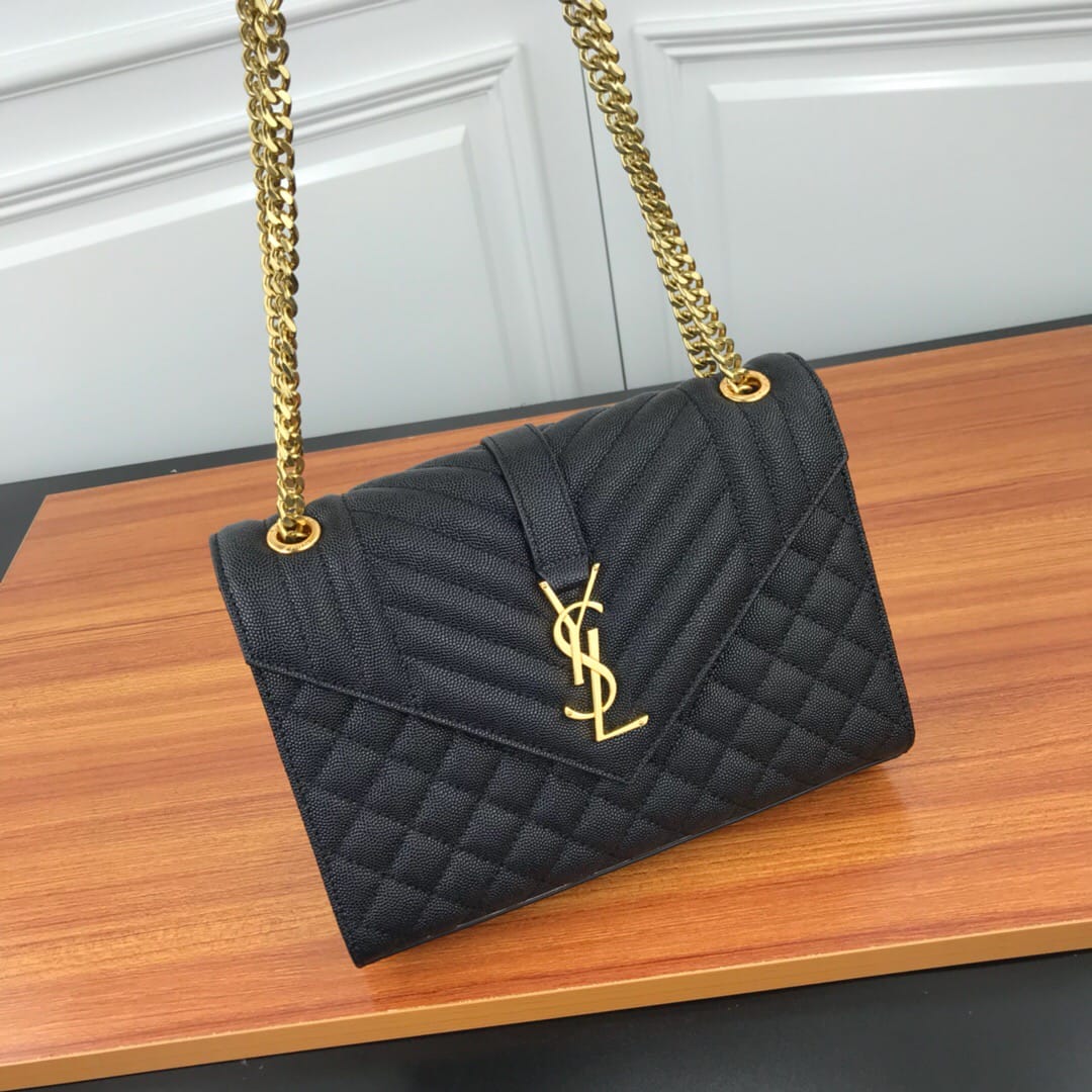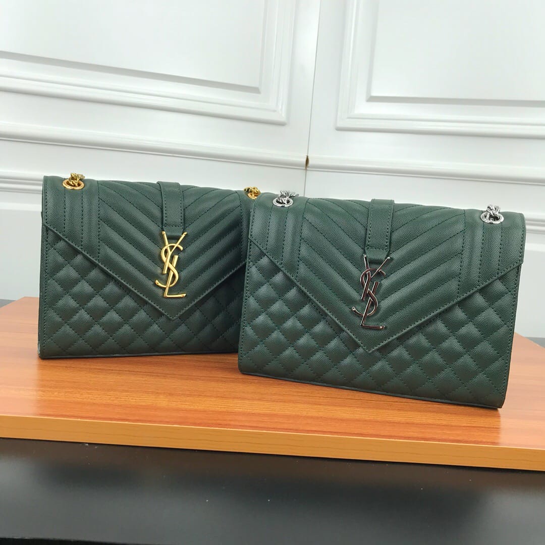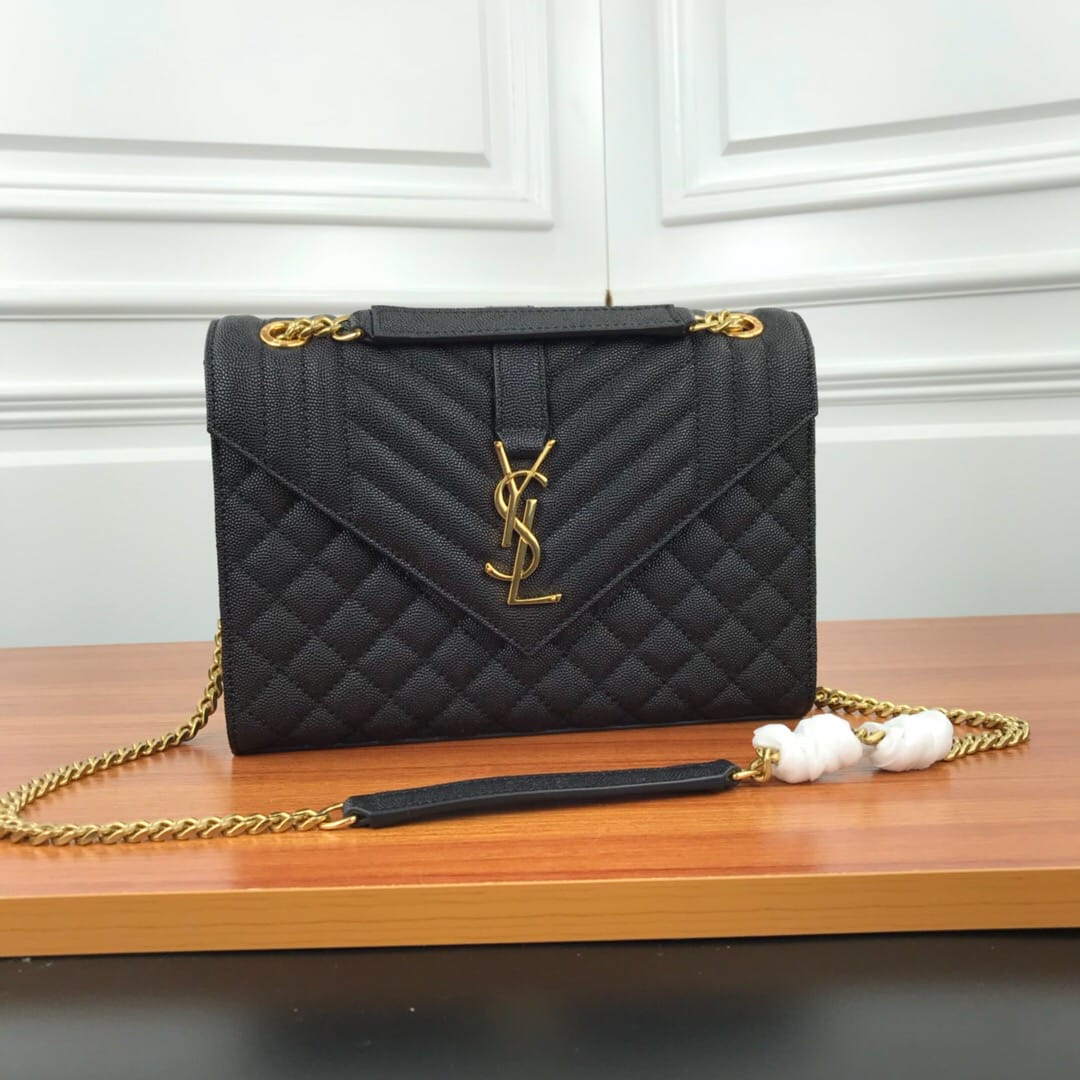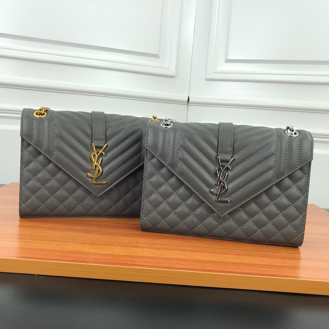SAINT LAURENT 标志正面翻盖包,配有金属联结 YSL 标志、真皮链条肩带及纵横绗缝拼接。尺寸24.0 17.5 6.0 CM 100% 小牛皮 罗缎衬里 折叠后肩带长度:26.5厘米,肩带长度:55厘米;肩带可缩短,呈现长肩风格 磁性四合扣封口 拉丝银色调金属五金 背面外插袋 1个插袋 型号:487206