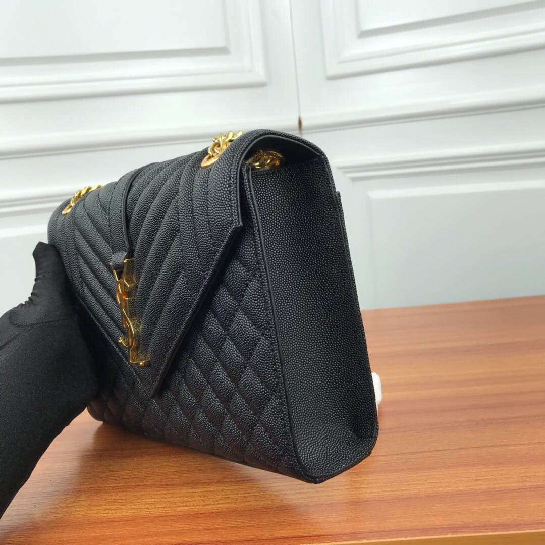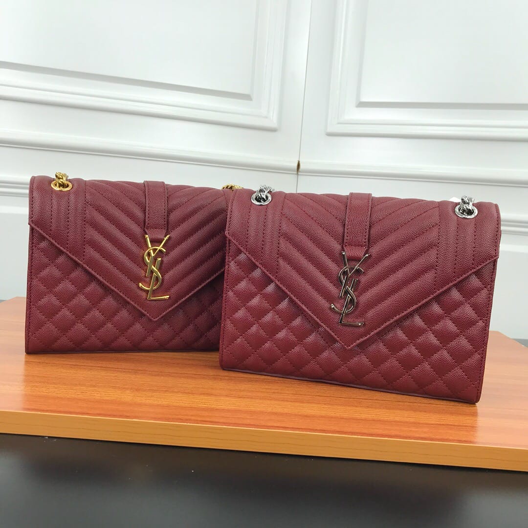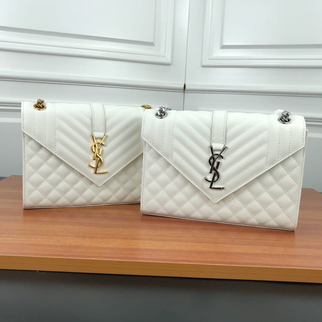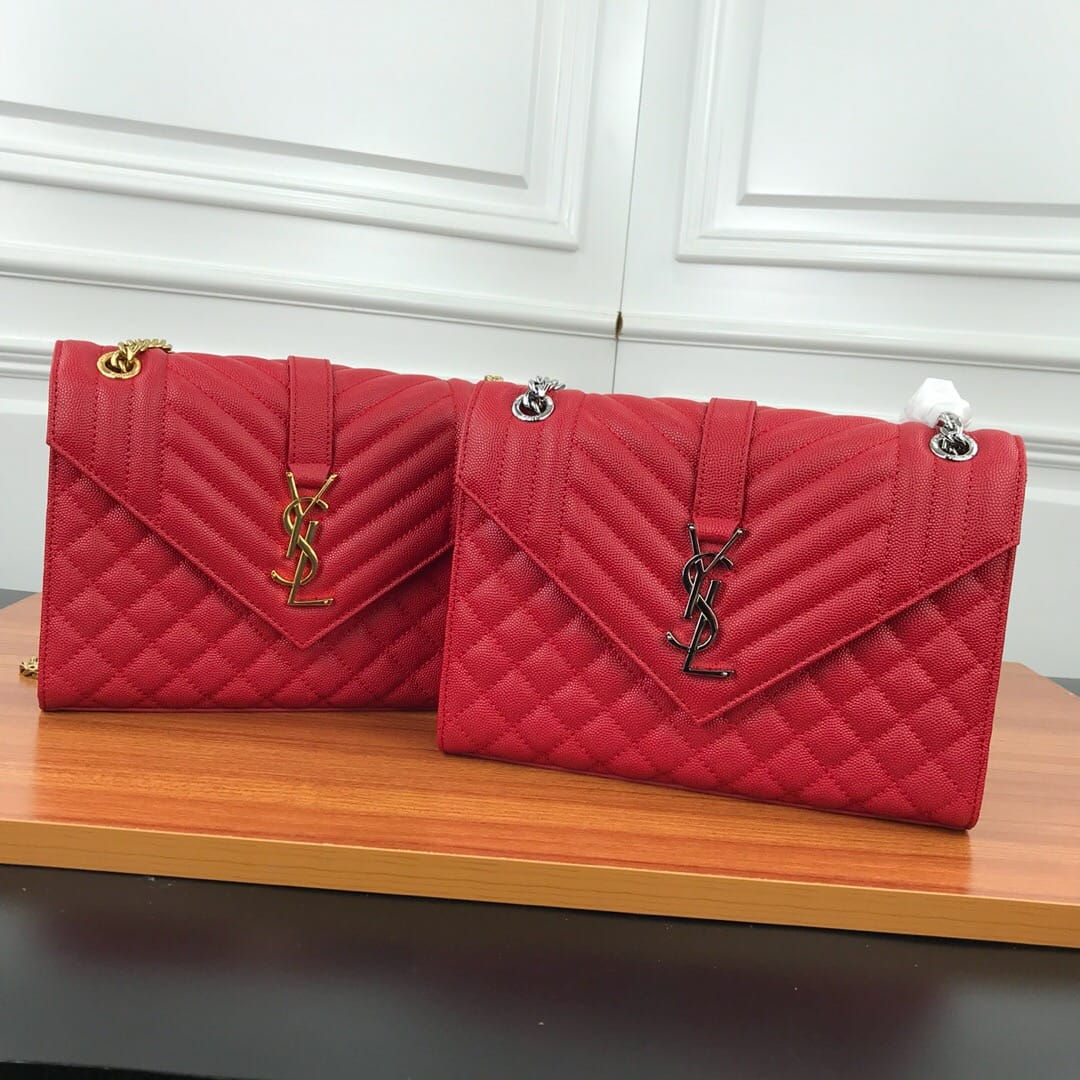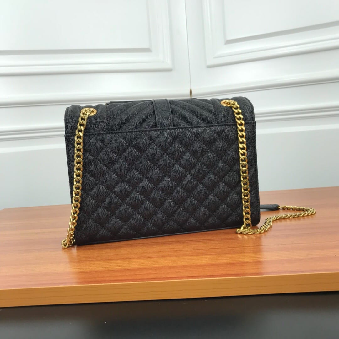 SAINT LAURENT 标志正面翻盖包,配有金属联结 YSL 标志、真皮链条肩带及纵横绗缝拼接。尺寸24.0 17.5 6.0 CM 100% 小牛皮 罗缎衬里 折叠后肩带长度:26.5厘米,肩带长度:55厘米;肩带可缩短,呈现长肩风格 磁性四合扣封口 拉丝银色调金属五金 背面外插袋 1个插袋 型号:487206