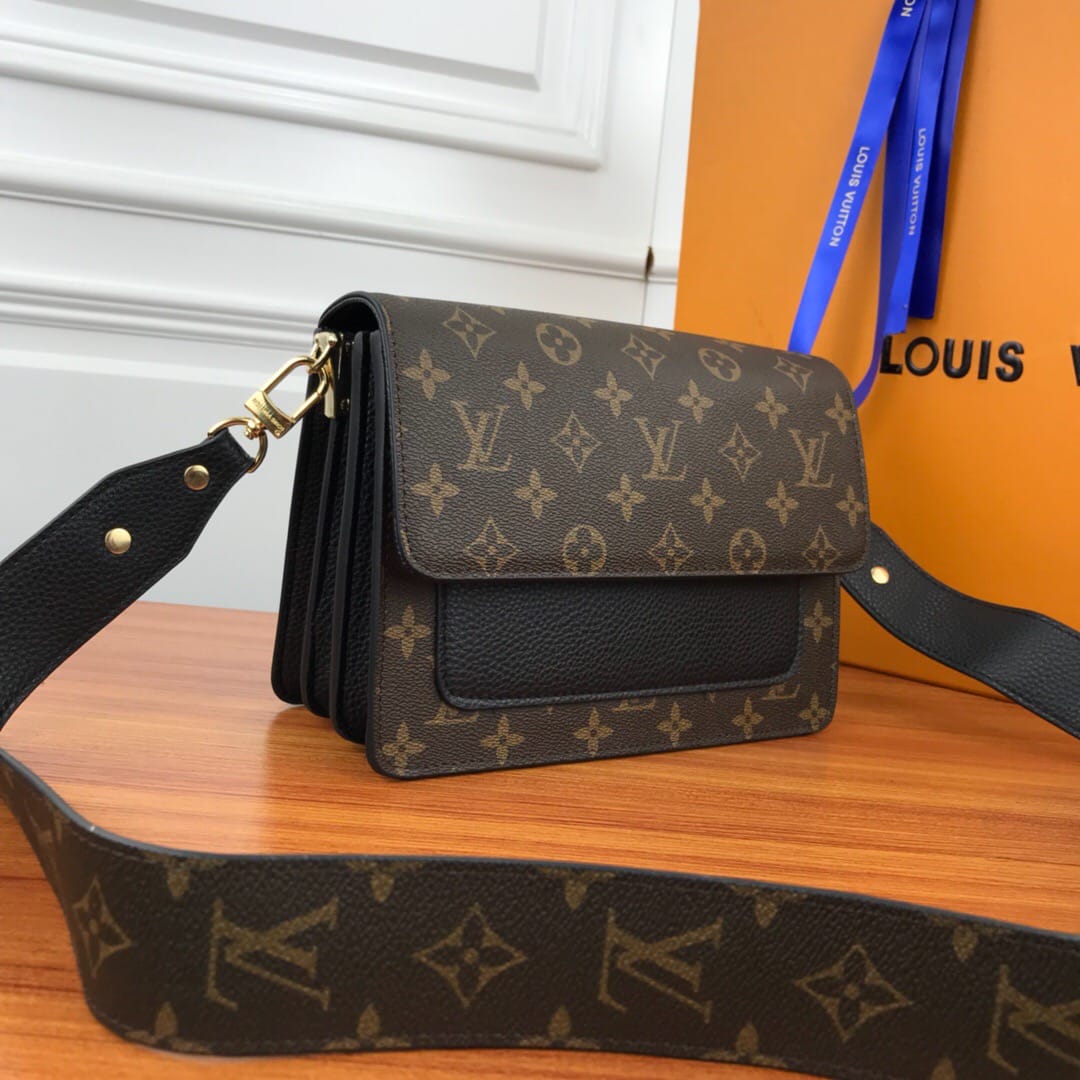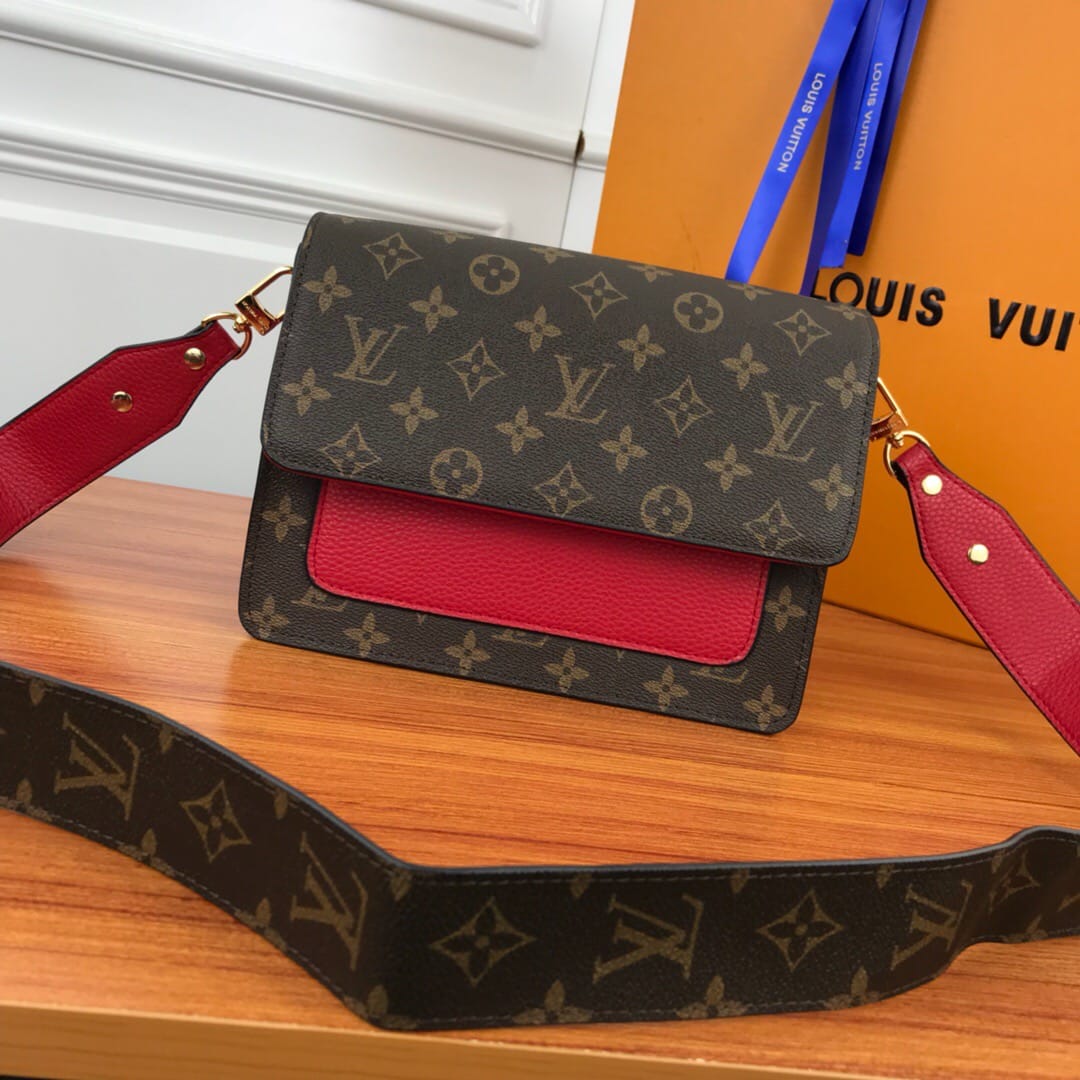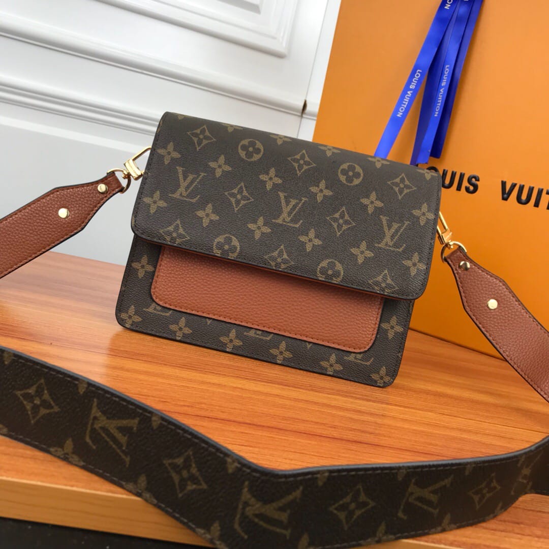 LV老花配皮 翻盖单肩斜挎包,型号66825 ,配宽肩带,