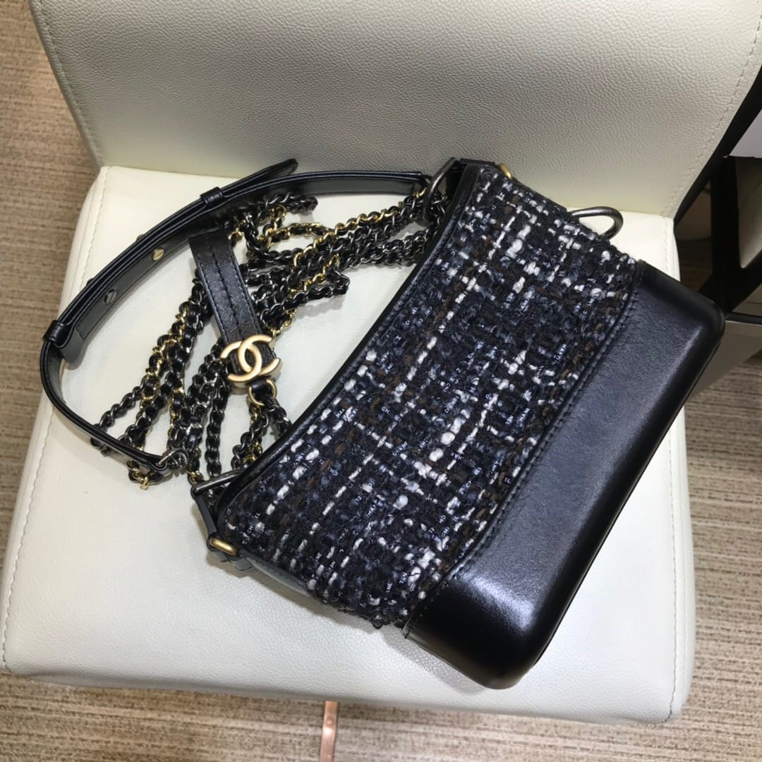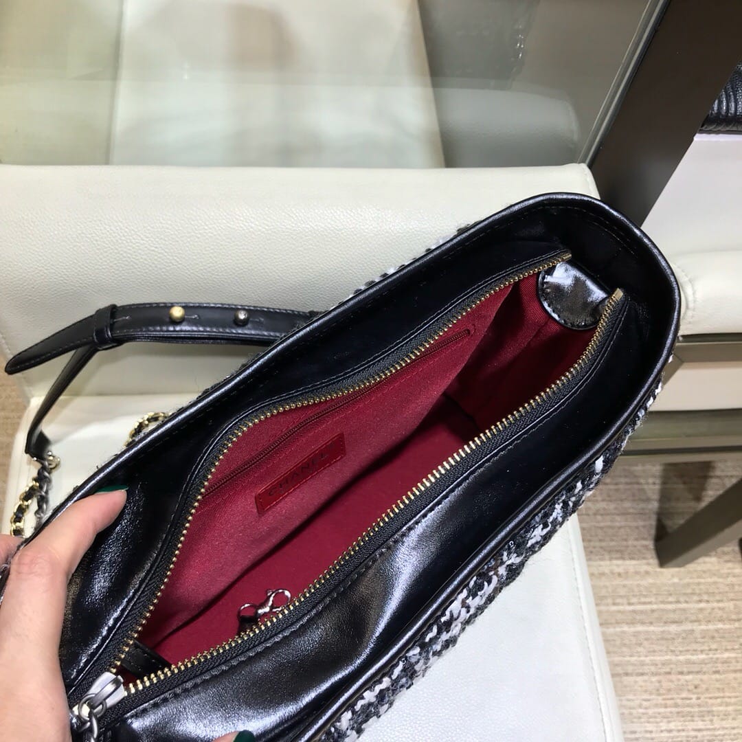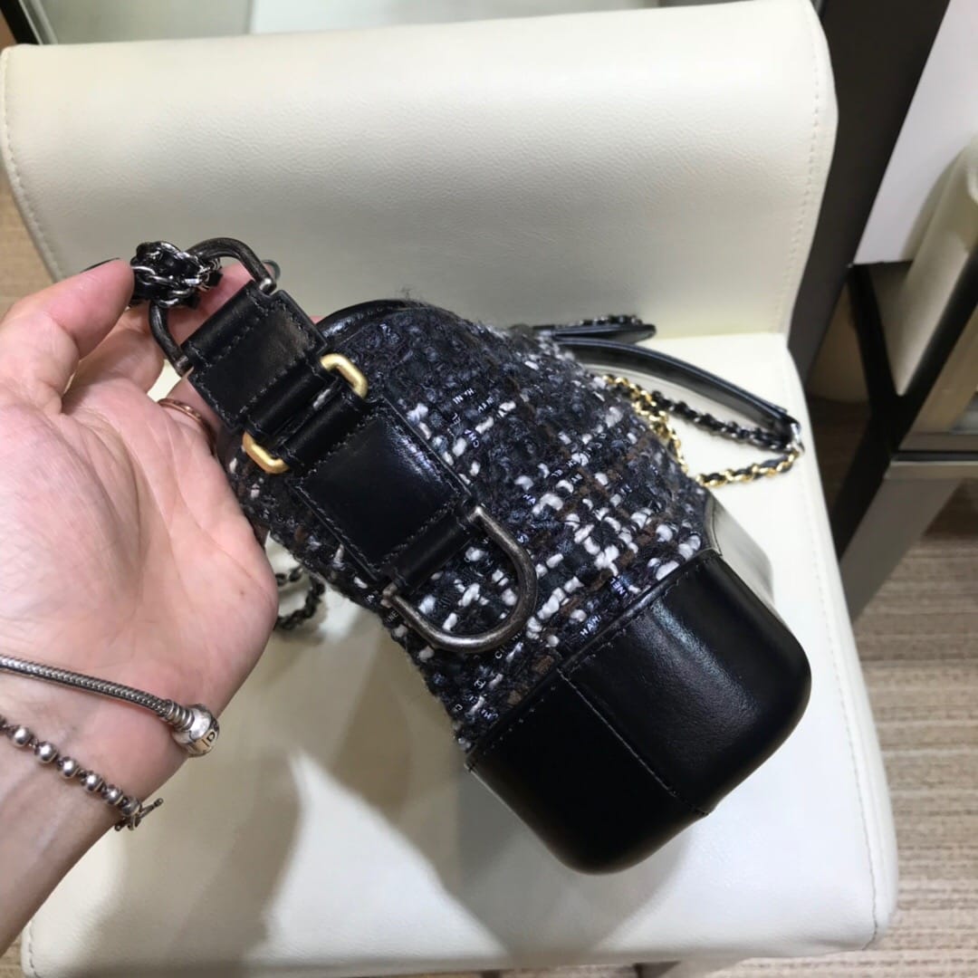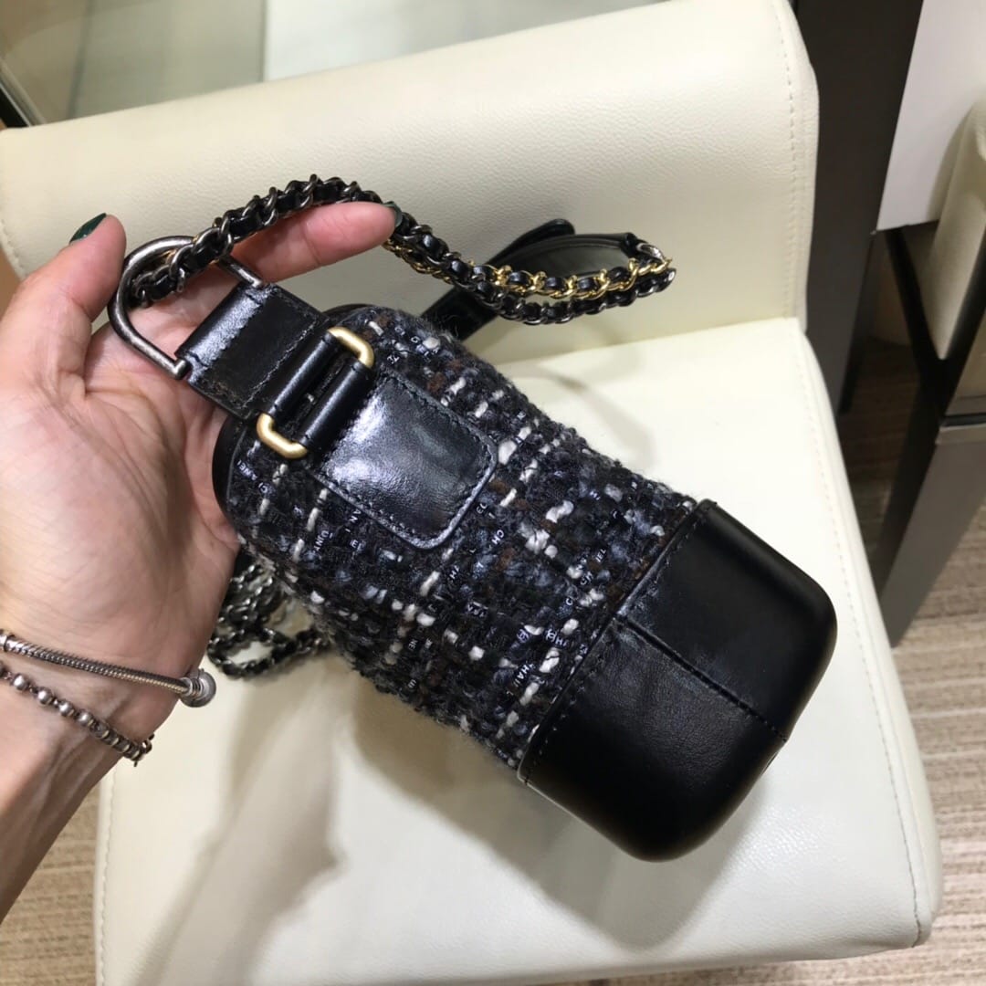 流浪包小号 8022呢子布料黑白配现货?小香18年最?爆新款 背带是用牛皮和金属环编织成的双链?可有多种不同背法??可以斜挎.单肩背.两肩背,超多背法??适合各种场合? 20cm