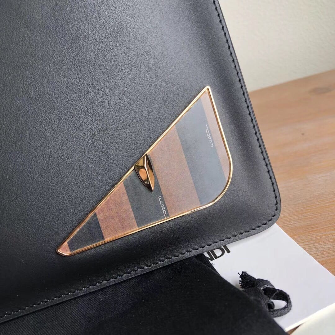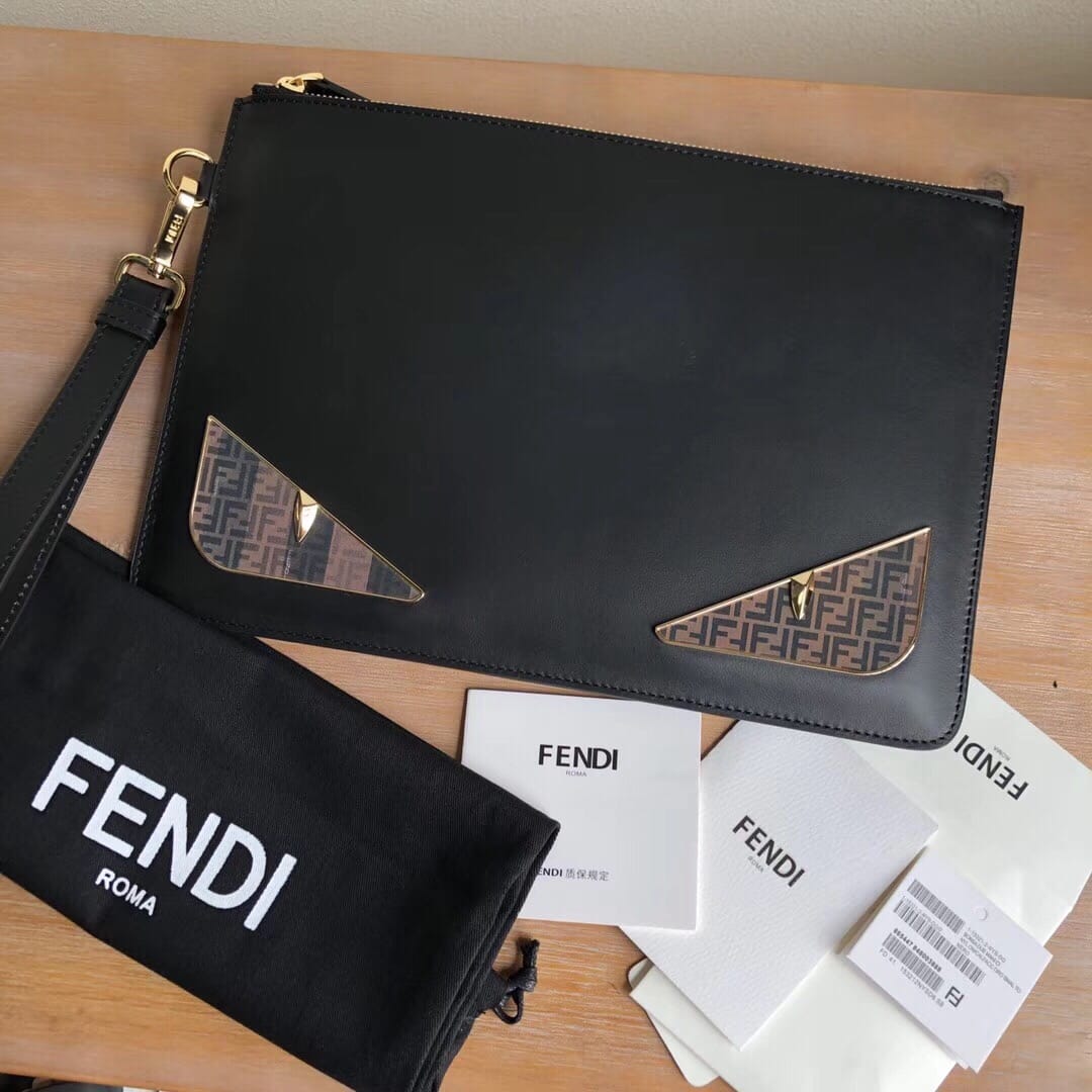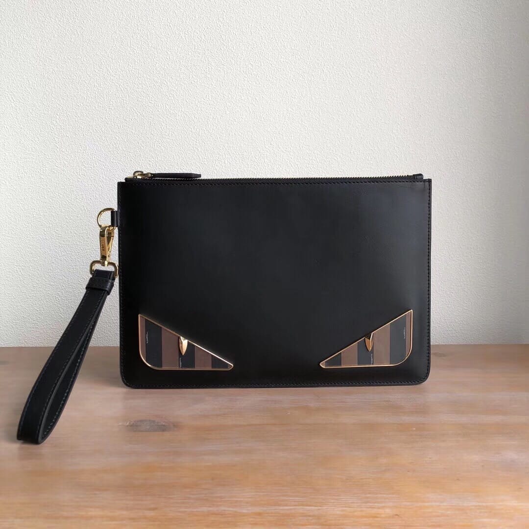 Fendi? Bag Bug手拿包。修长拉链小口袋??黑色小牛皮材质?饰以花押字图案和形似“Bag Bugs眼睛”的金属装饰。尺寸:29*19*1