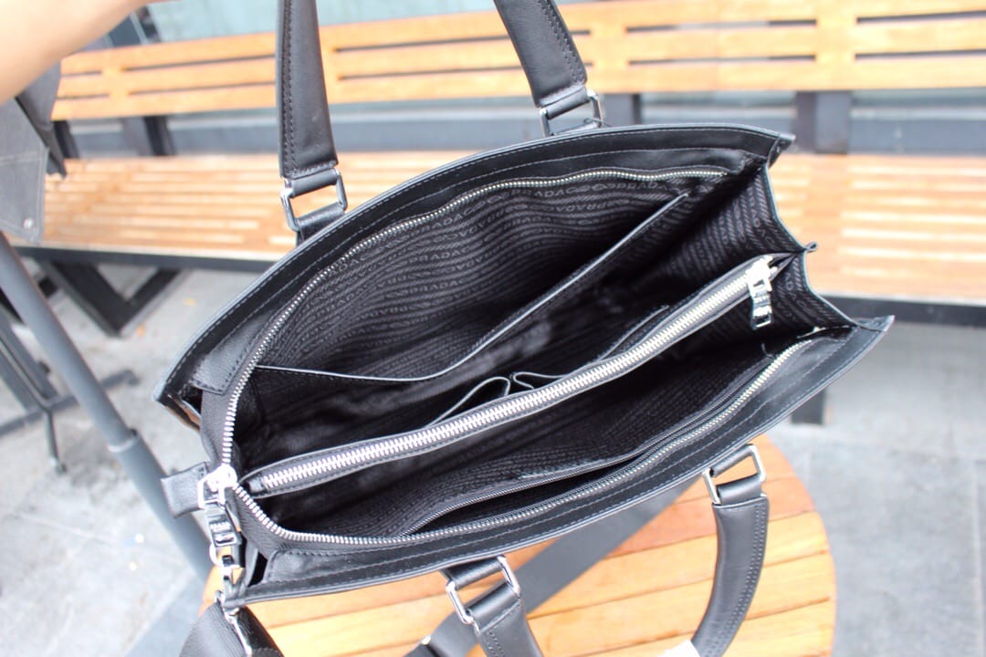 Prada [玫瑰]专柜爆款,普拉达Prada男手提包[强][强] 普拉达最新款?,?帅到没朋友[玫瑰][玫瑰]采用顶级进口原版牛皮做为包身材料包包柔软度极好 富有弹性 ? ? 原版五金配置更显高贵气质 时尚大气兼实用...? 颜色 ? [愉快]黑色? 型号 ? [愉快]00012? 尺寸 ? 38.5x28x9cm