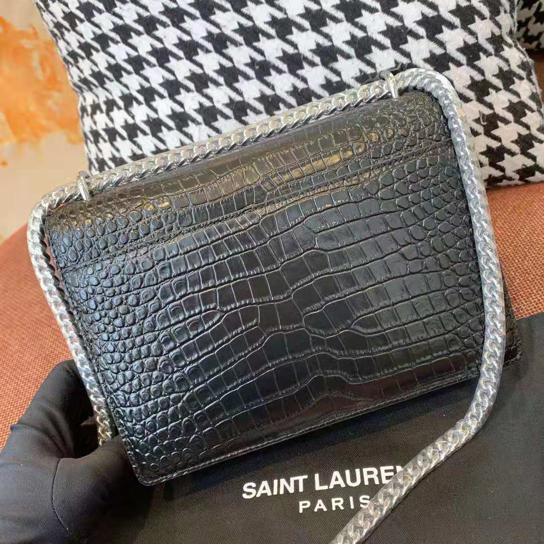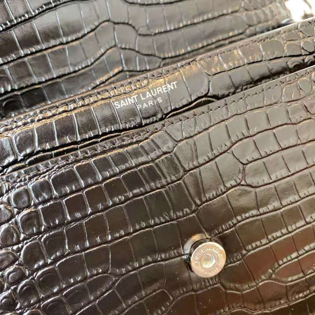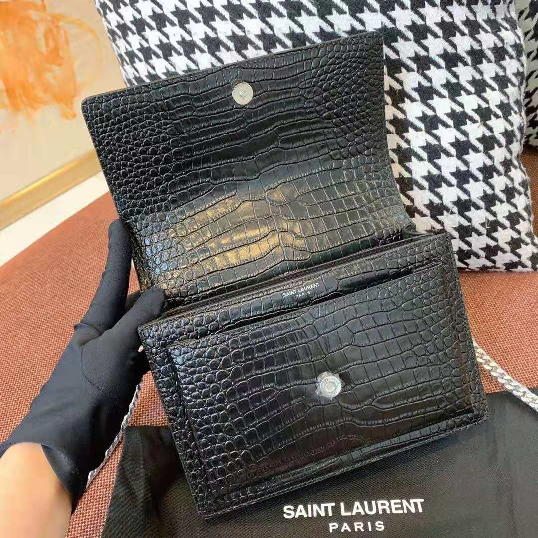 原单Saint Laurent Monogram Sunset 手袋、?、欢乐颂2??王子文同款,?采用进口鳄鱼??牛皮??SAINT LAURENT 前翻盖手袋,采用侧面手风琴式皱褶,可斜挎或对折挎在肩上的皮革配铁链肩带,金属联结YSL标志、彰显品牌形象款型号8001鳄鱼纹牛皮、22*8*14