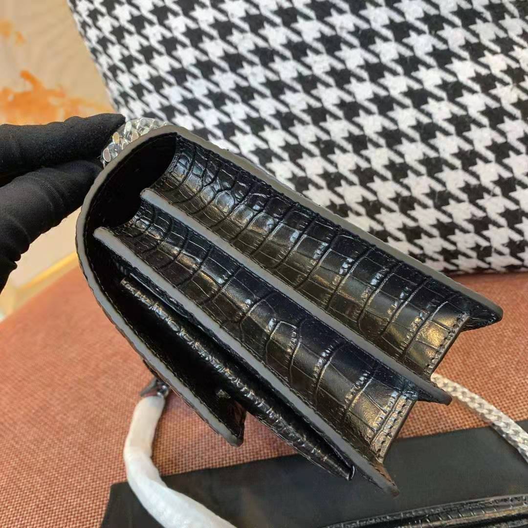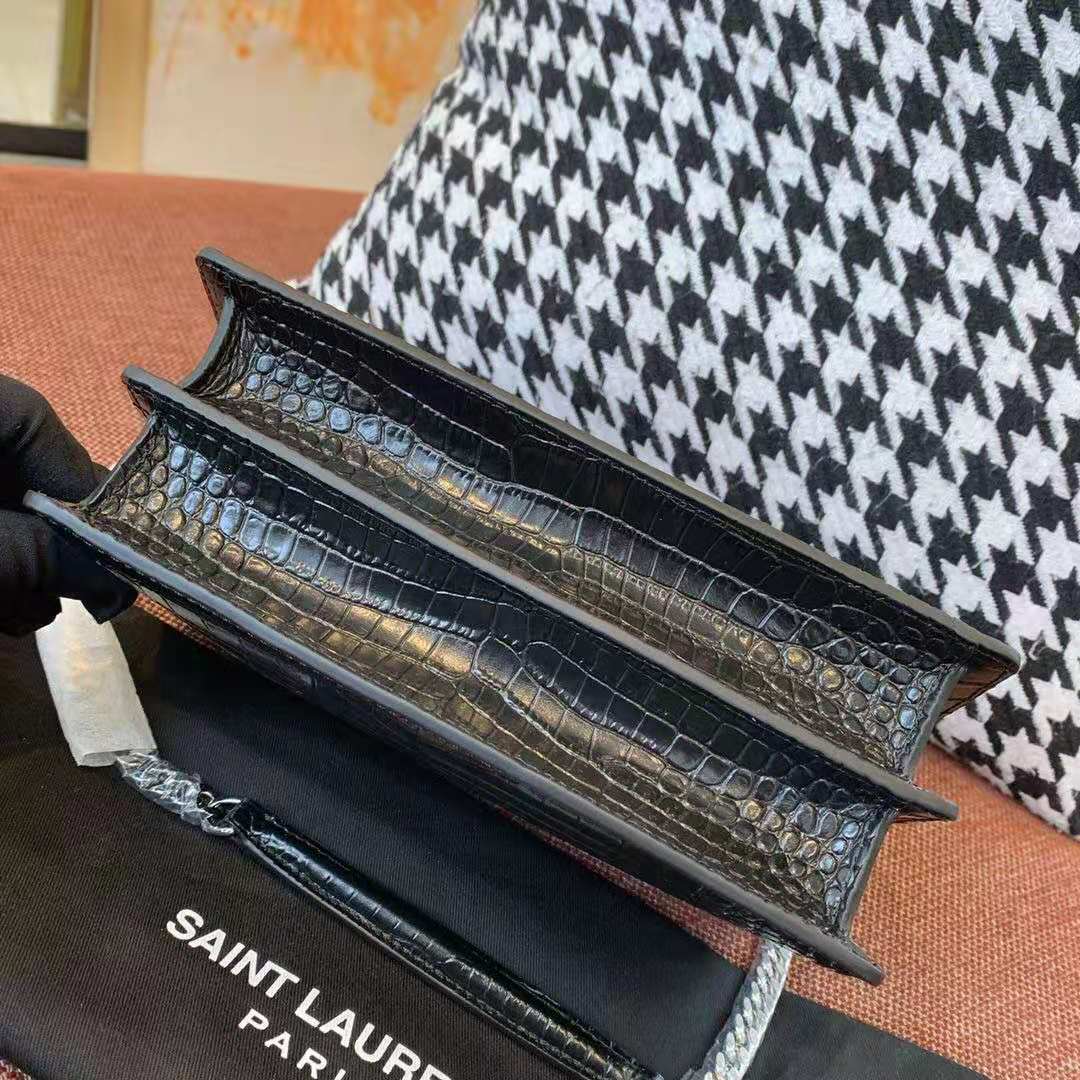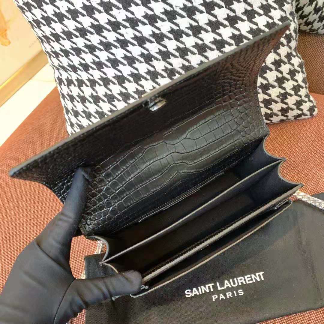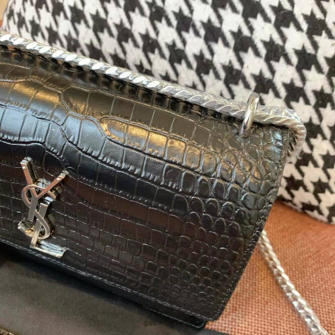 原单Saint Laurent Monogram Sunset 手袋、?、欢乐颂2??王子文同款,?采用进口鳄鱼??牛皮??SAINT LAURENT 前翻盖手袋,采用侧面手风琴式皱褶,可斜挎或对折挎在肩上的皮革配铁链肩带,金属联结YSL标志、彰显品牌形象款型号8001鳄鱼纹牛皮、22*8*14