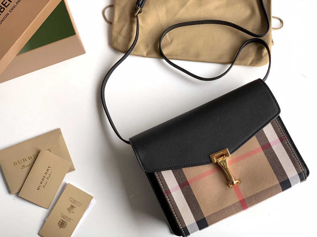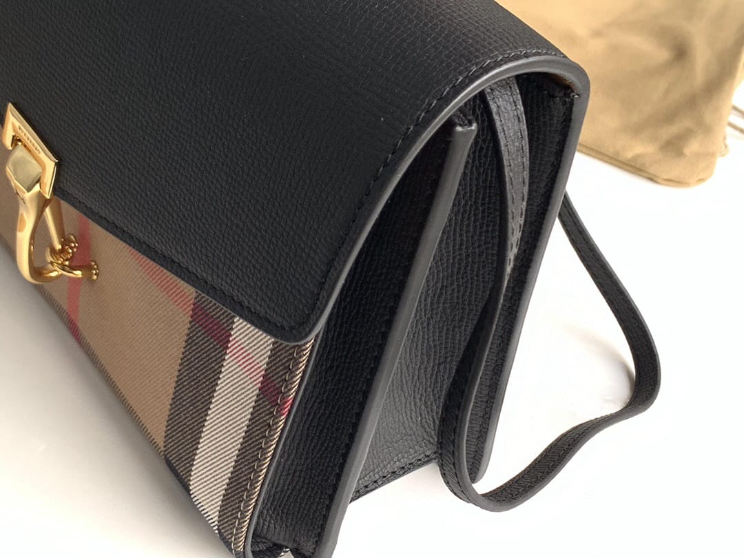 Burberry?博柏利】原单出品??~~House格纹拼皮革斜背包 ,精选粒纹皮革材质,搭配大号金属锁扣。卸下背带缔造手拿包造型。 ? 包包可轻松收纳手机?、唇膏?及卡片等 ??专柜品质、做工精细?实物拍摄?,??39808251黑色,尺寸24cm*18cm*8cm
