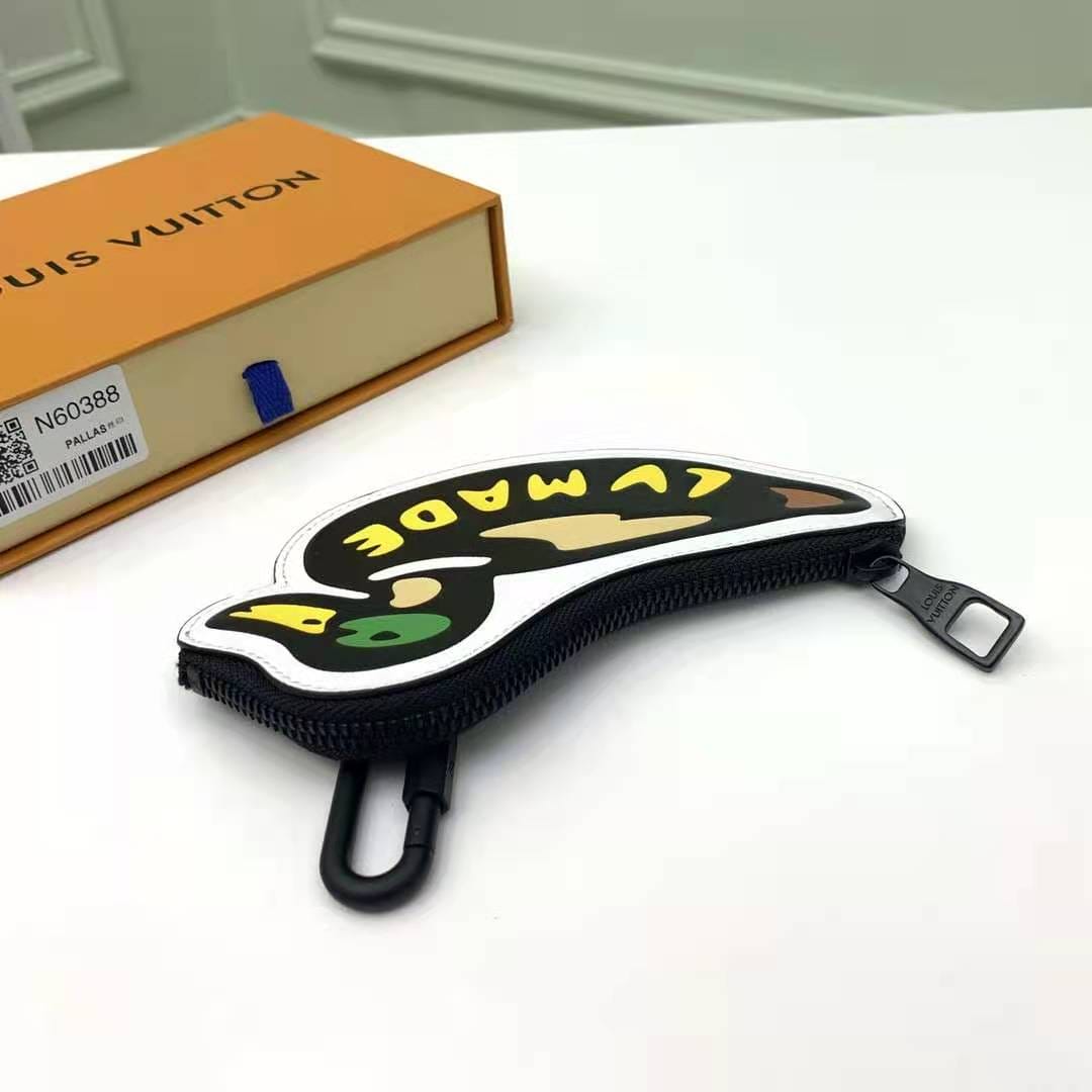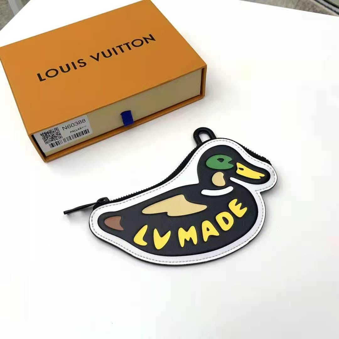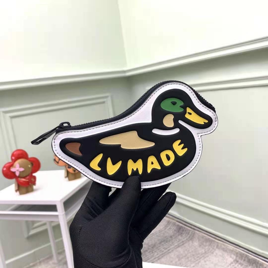 【原单】N60388DUCK 零钱卡夹 Duck ??零钱卡夹来自 Virgil Abloh 和日本设计师 Nigo 的联名系列。一面呈现 Giant Damier Ebene 图案,翻转即现 Nigo 绘制的鸭子身披 LV MADE 标识之景。皮革 D 形环方便固定于手袋。尺寸: 10.5 x 17.0 x 1.0 cm 。